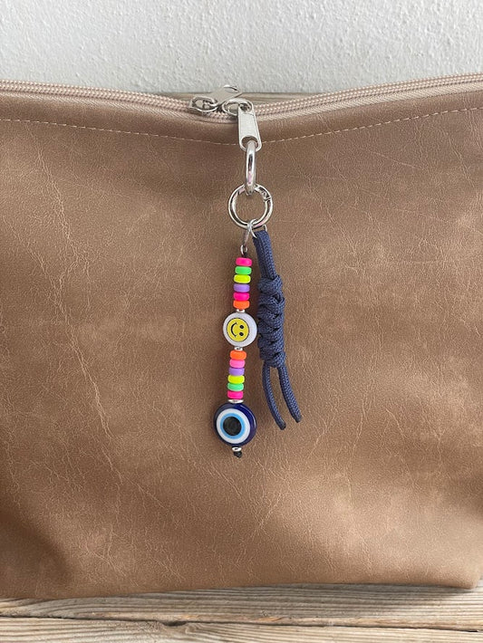 Evil Eye Smiley Face Bag Charm with Multicolor Rubber Beads