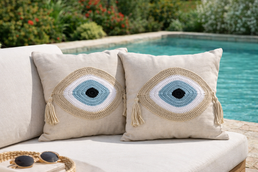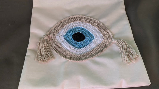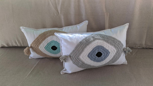 Handmade Evil Eye Cushion Cover – Greek Inspired Crochet Design, White Canvas Fabric