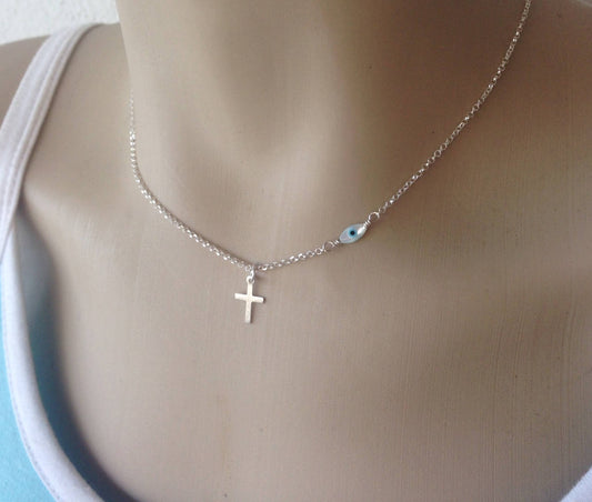 Evil Eye Cross Pendant Necklace - Sterling Silver Necklace