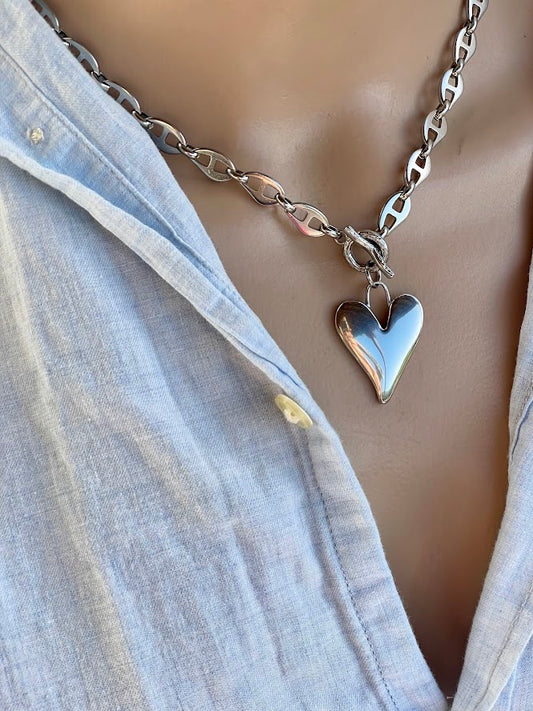 Big Silver Heart Statement Necklace - Stainless Steel Jewelry - Gift for Her