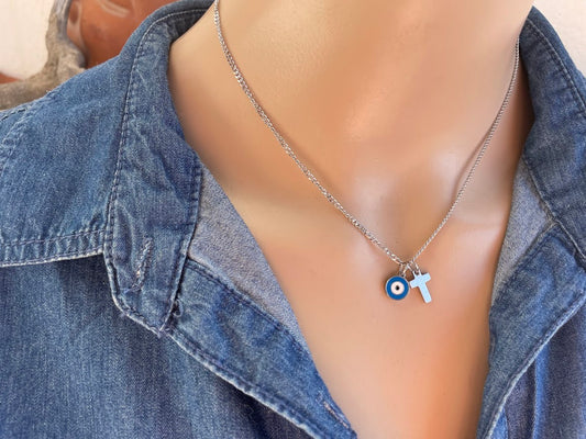 Evil Eye Cross Charms Necklace - Stainless jewelry - Gift for her - Tiny jewelry - Greek Gift