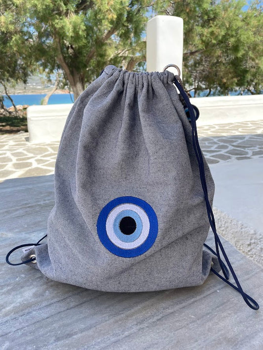 Sac à Dos en Jean Bleu-Gris avec Oeil Bleu Brodé – 40 x 45 cm