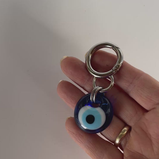 Porte-bonheur œil bleu en verre – Bijou de sac avec anneau ressort en métal argenté
