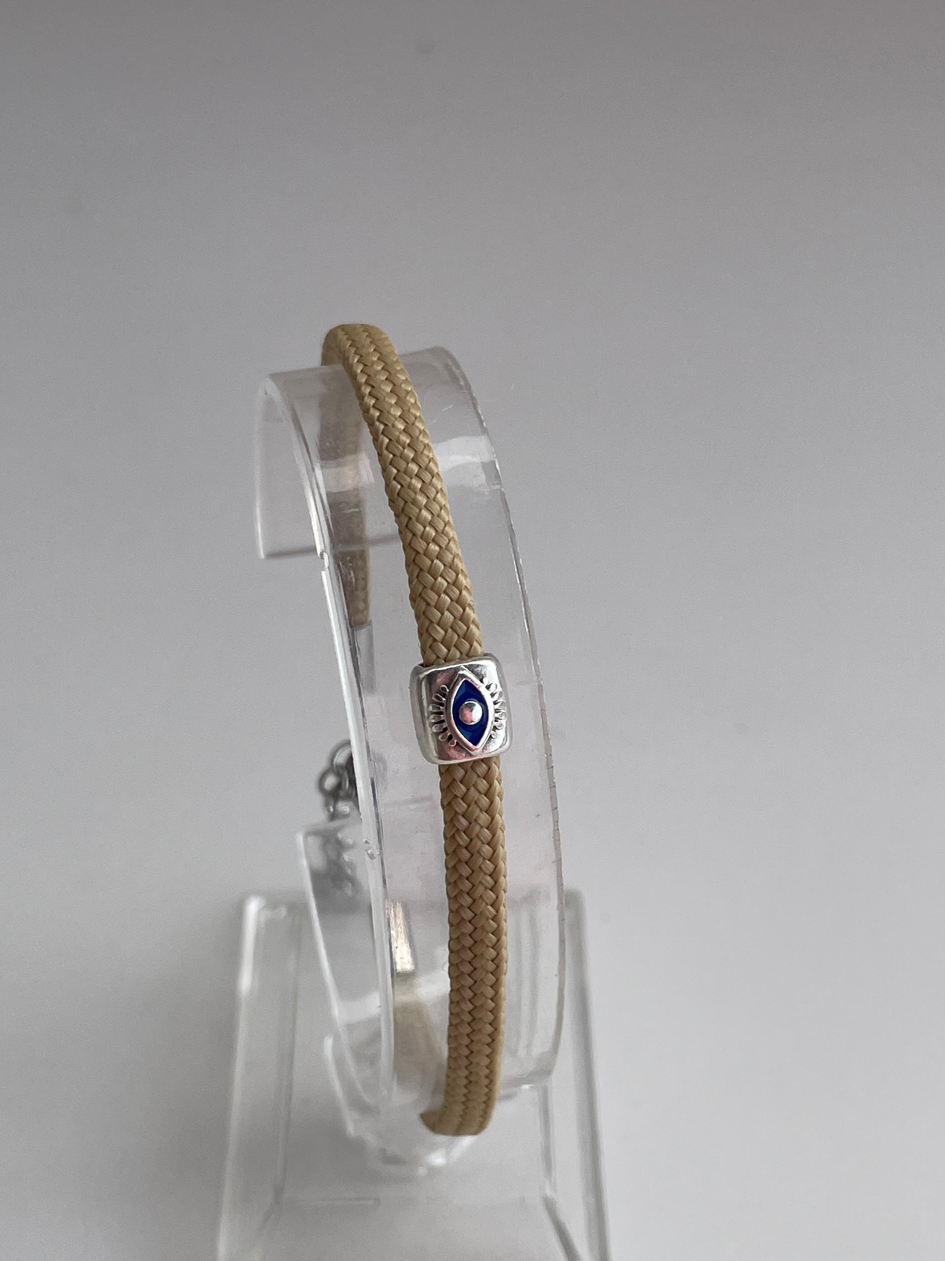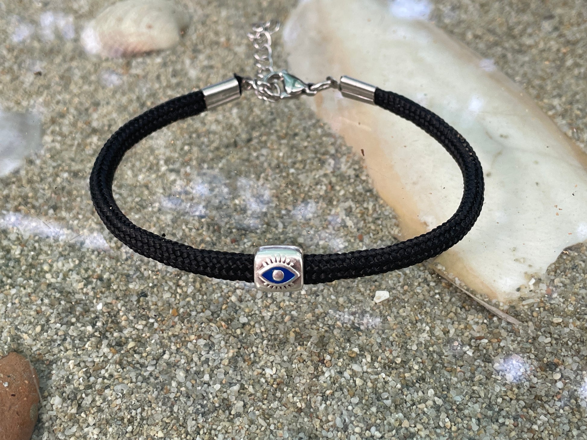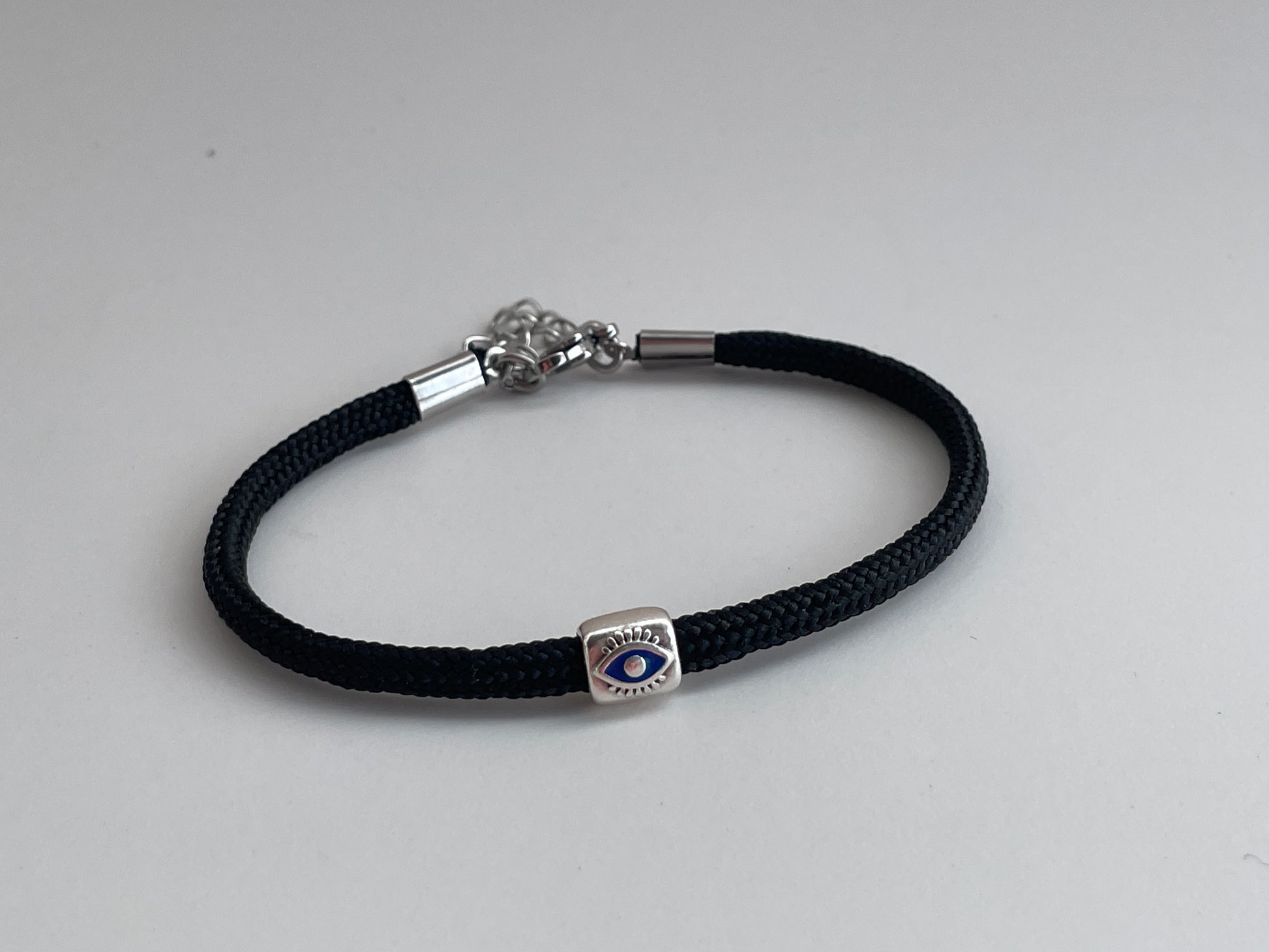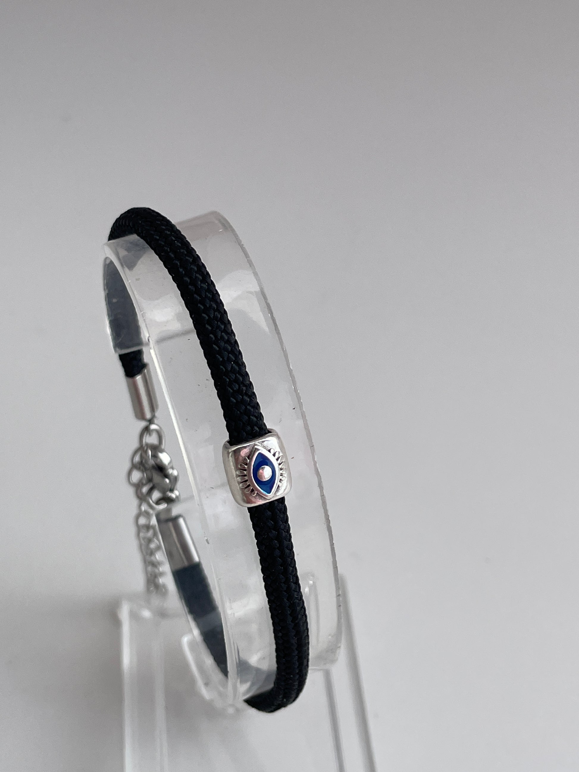 Confectionné avec un cordon paracorde de 4 mm, il est décoré d’un œil en métal zamak plaqué argent 999 (2 microns), mesurant 8x6 mm. Le bracelet se ferme avec des embouts en acier inoxydable et dispose d’une chaîne d’extension, s’adaptant facilement à toutes les tailles de poignet.