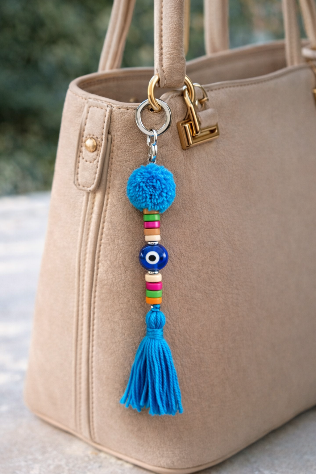 Ajoutez une touche de couleur et de protection à vos accessoires avec notre bijou de sac Pompon Œil Porte-Bonheur fait main.
