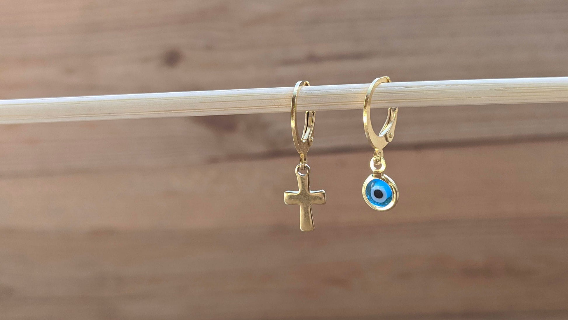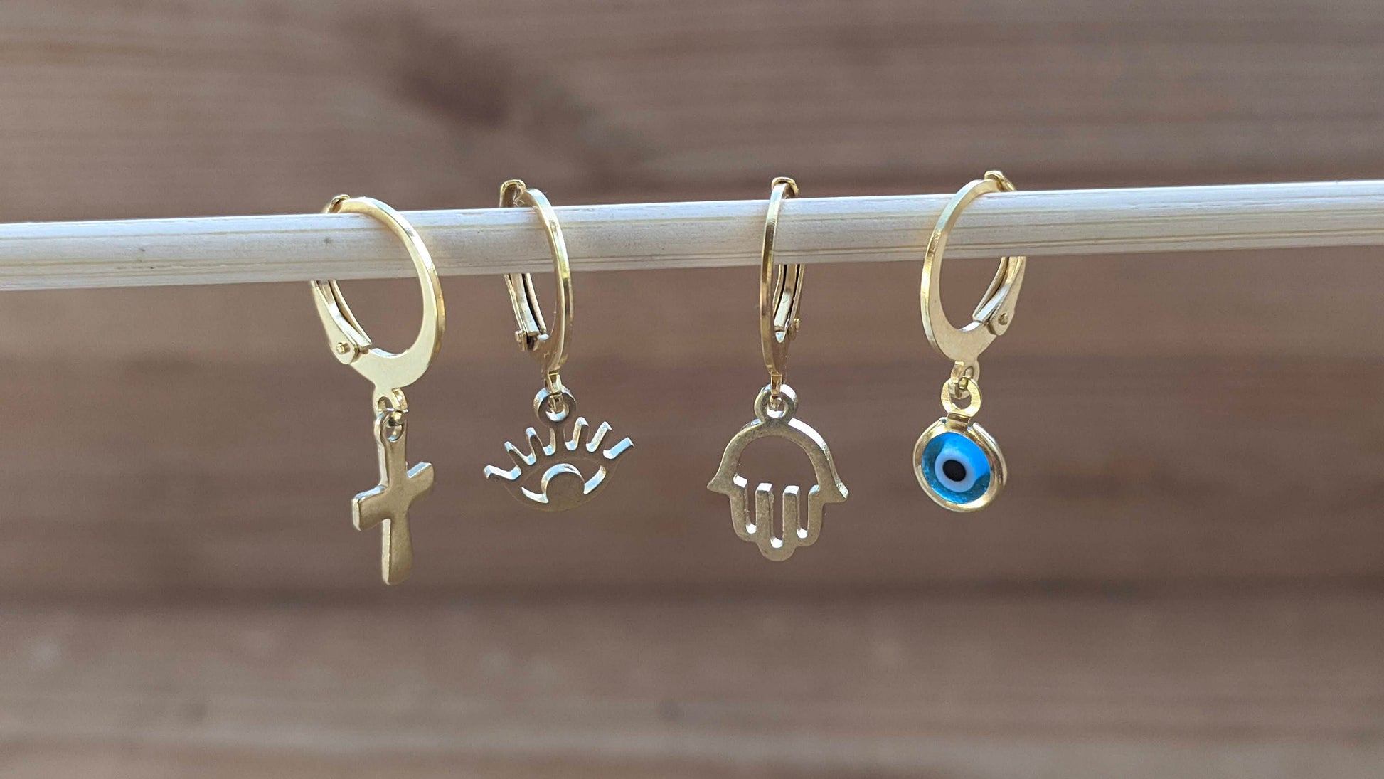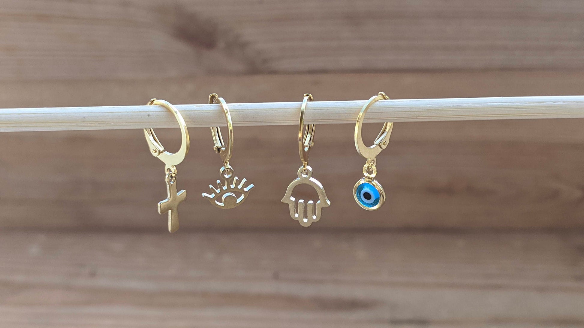 Boucles d'Oreilles Créoles Oeil Bleu - Main de Fatma - Croix