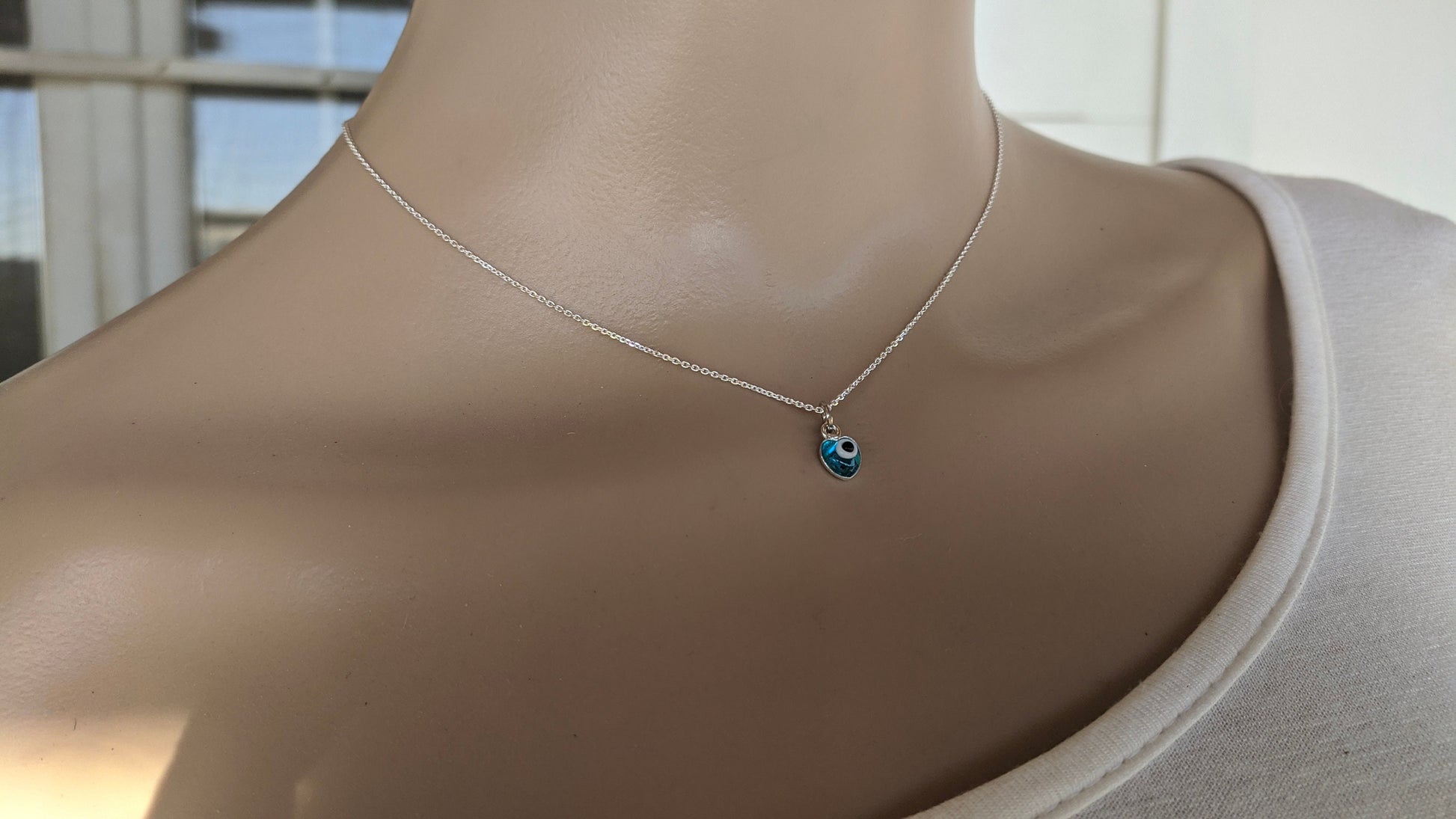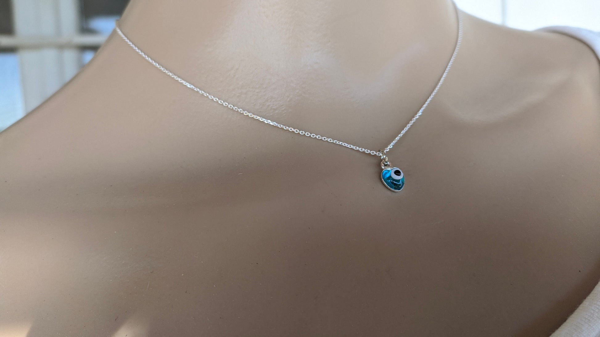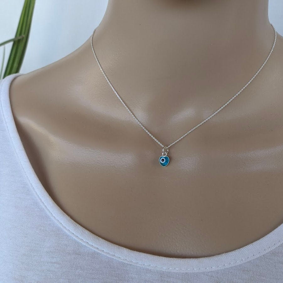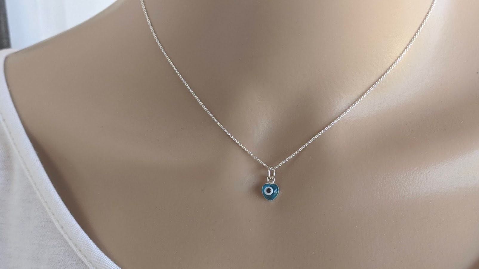 Découvrez l'élégance et la protection incarnées dans notre collier pendentif cœur oeil bleu, fabriqué en argent 925. Ce collier présente un petit œil en verre serti dans un cabochon en argent, ornant une fine et délicate chaîne en argent sterling. La breloque en forme de cœur bleu translucide contre le mauvais œil, mesurant 6 mm (0,23" de diamètre) avec un œil d'un côté, symbolise la défense contre le mauvais œil.
