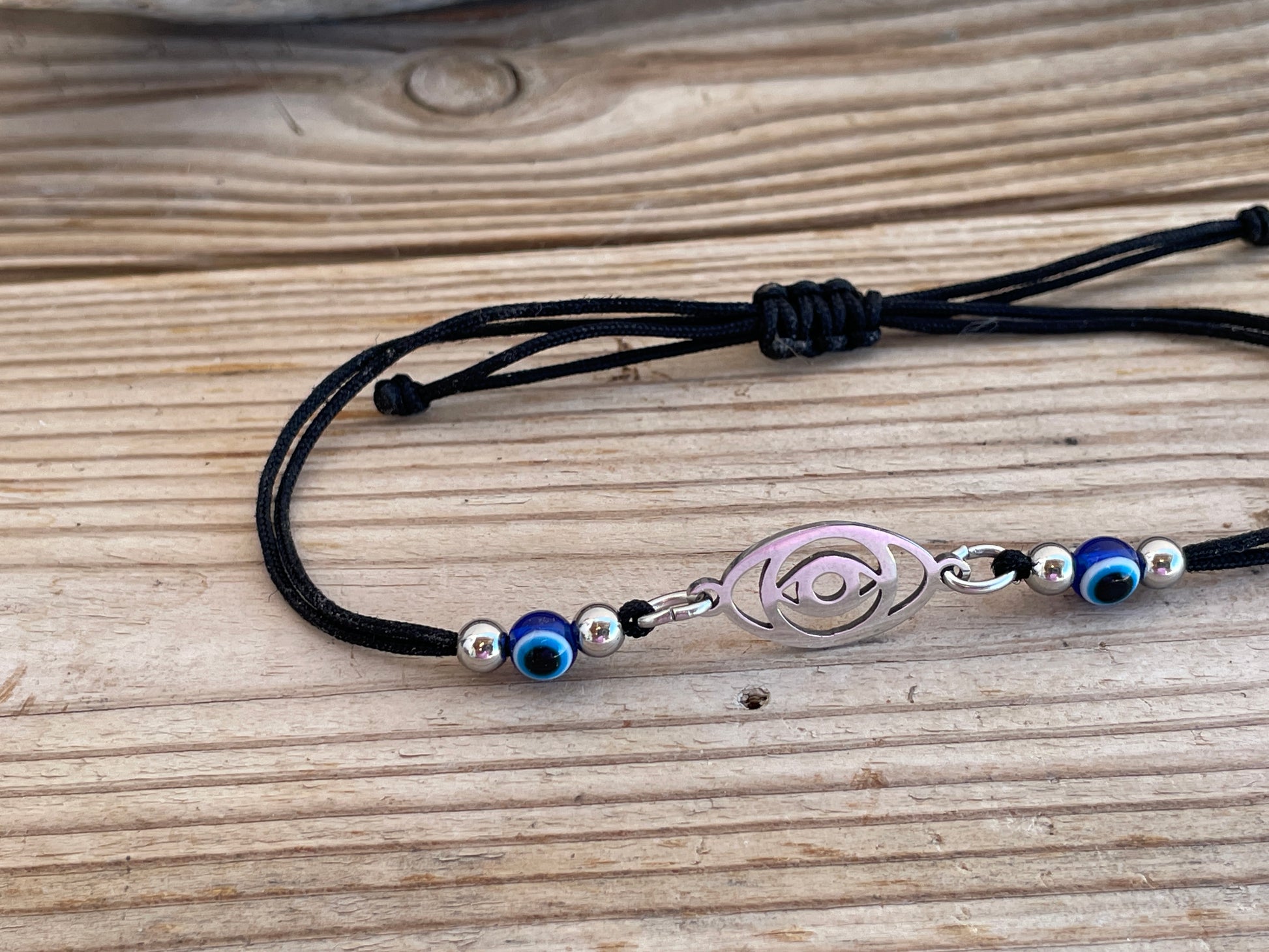 Ce bracelet unisexe est orné d’un pendentif central en acier inoxydable en forme d’œil, accompagné de perles œil bleu et de perles rondes en acier de chaque côté. Il est monté sur un cordon noir avec un fermoir coulissant réglable, ce qui le rend facile à enfiler et à retirer. Convient à la plupart des tailles de poignet.