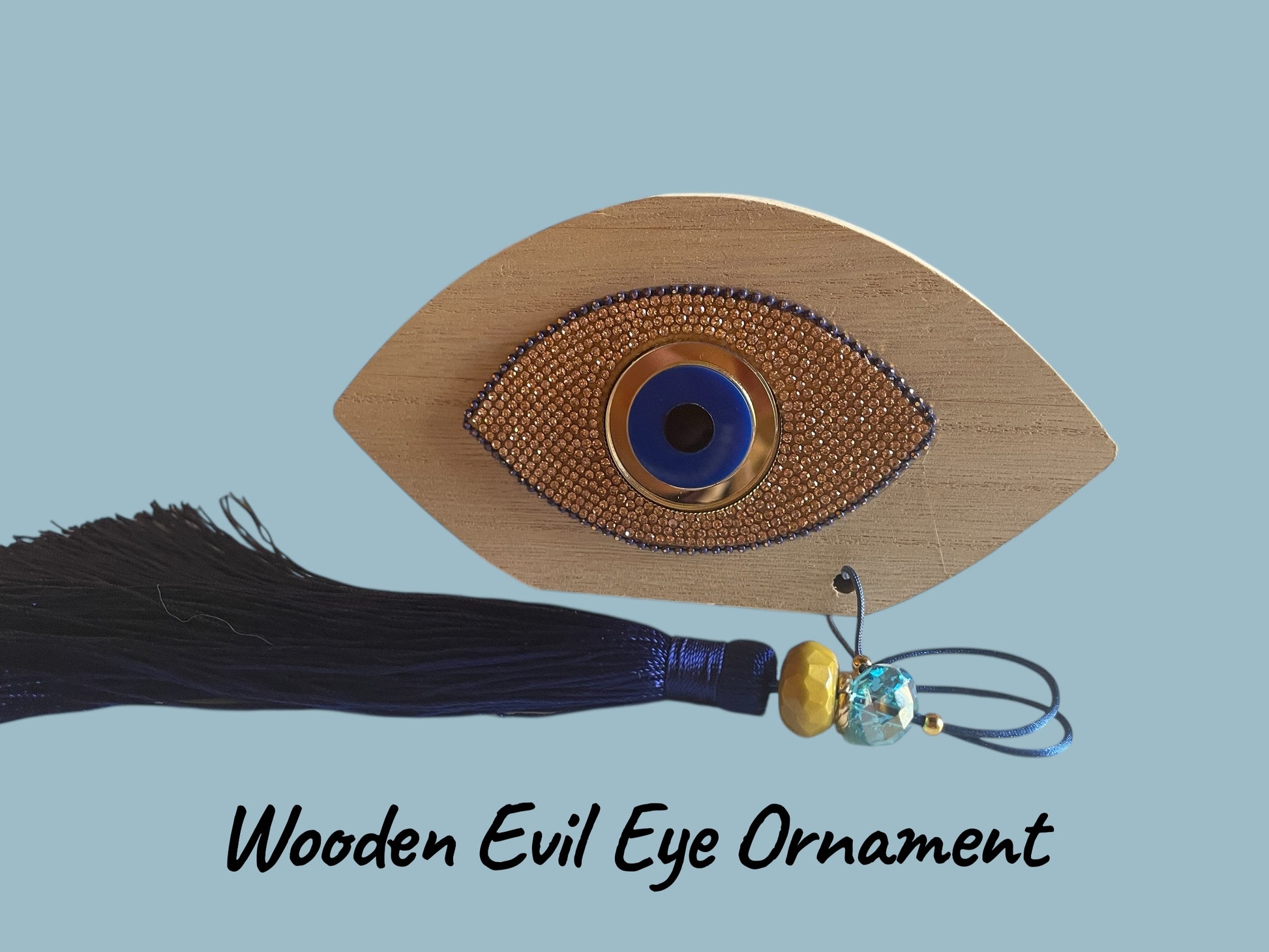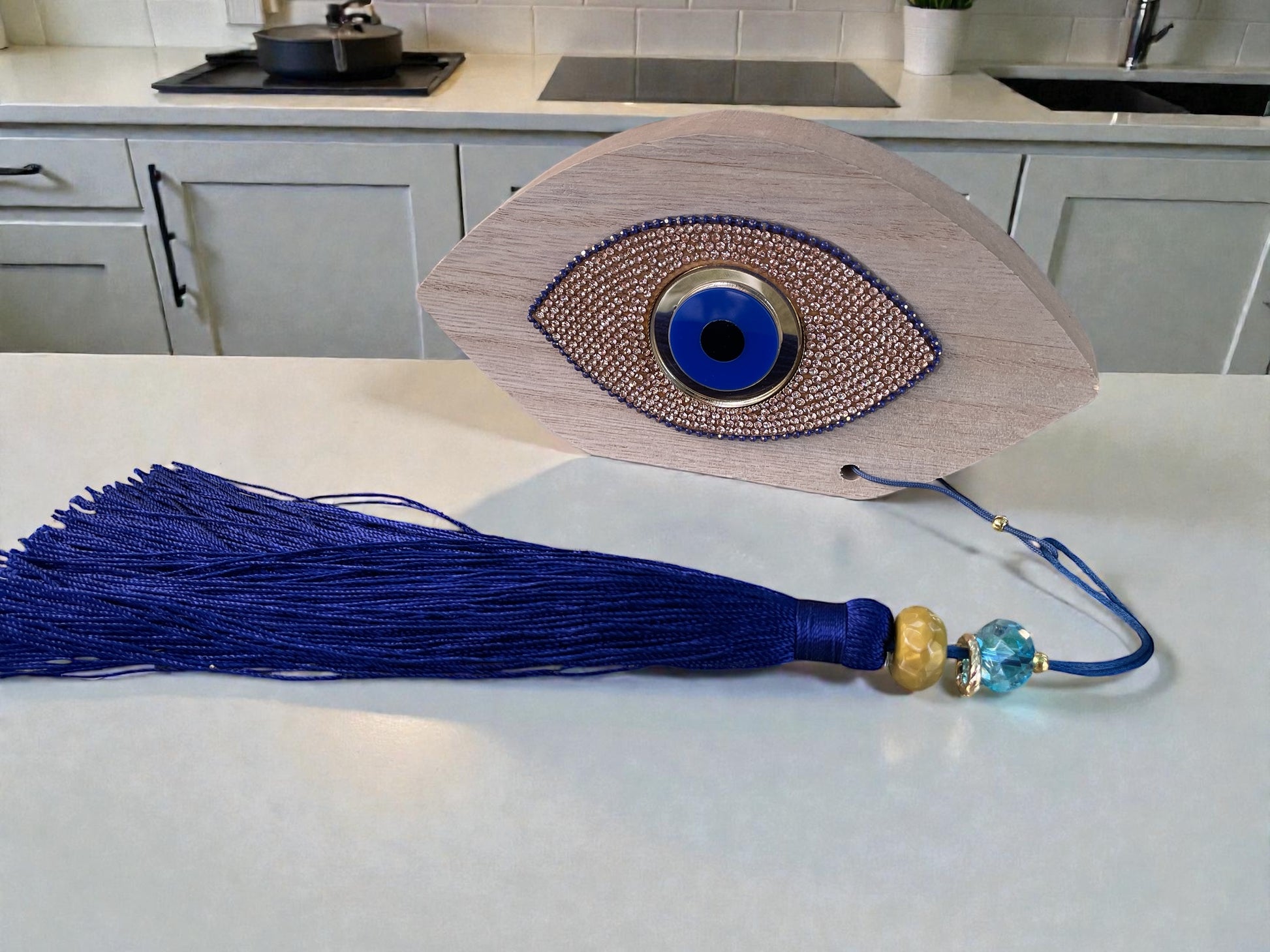 Apportez une touche d’élégance et de protection à votre intérieur avec cette pièce artisanale unique. Réalisée entièrement à la main, cette décoration se compose d’un œil en bois (16 x 8,5 x 2 cm) orné d’un œil en plexiglas, de perles raffinées et de délicats éléments en laiton doré.