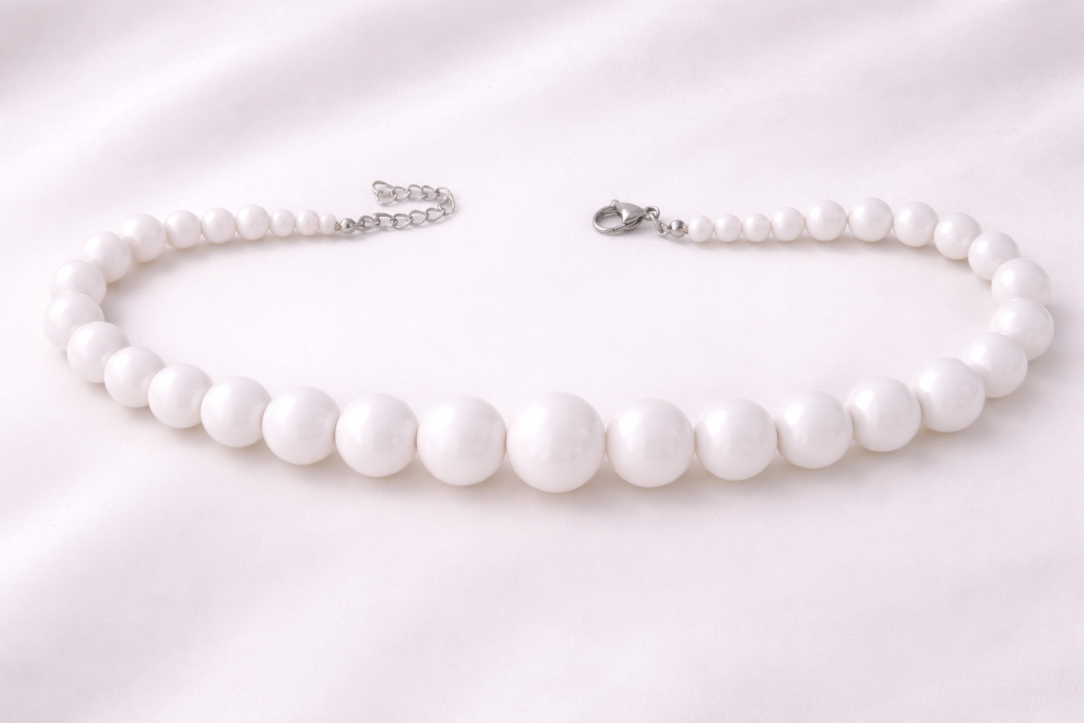This acrylic bead necklace features a bold yet elegant design, combining modern style with timeless appeal. It is made with a beautiful gradient of acrylic beads in varying sizes, measuring 6, 8, 10, 12, 14, 16, and 18 mm, creating a striking visual balance and a fashionable statement look.