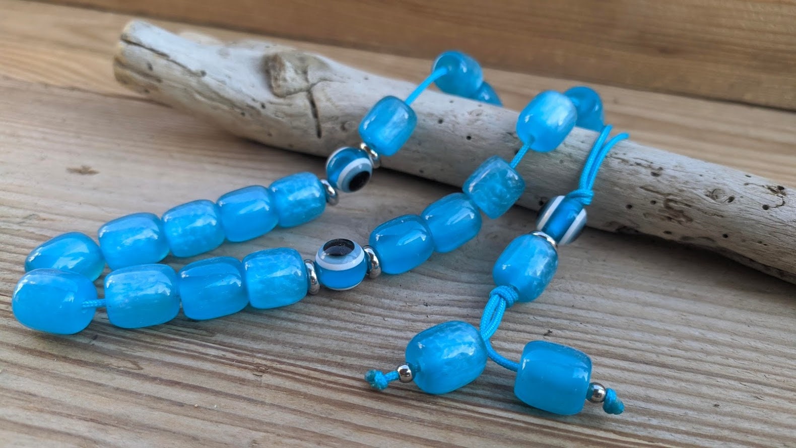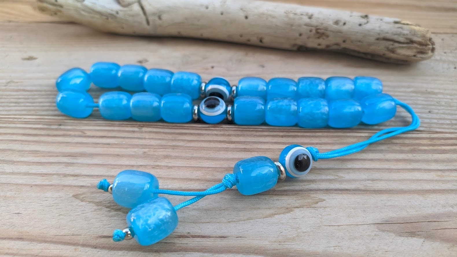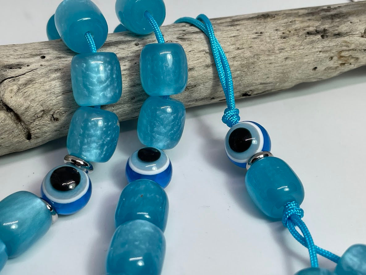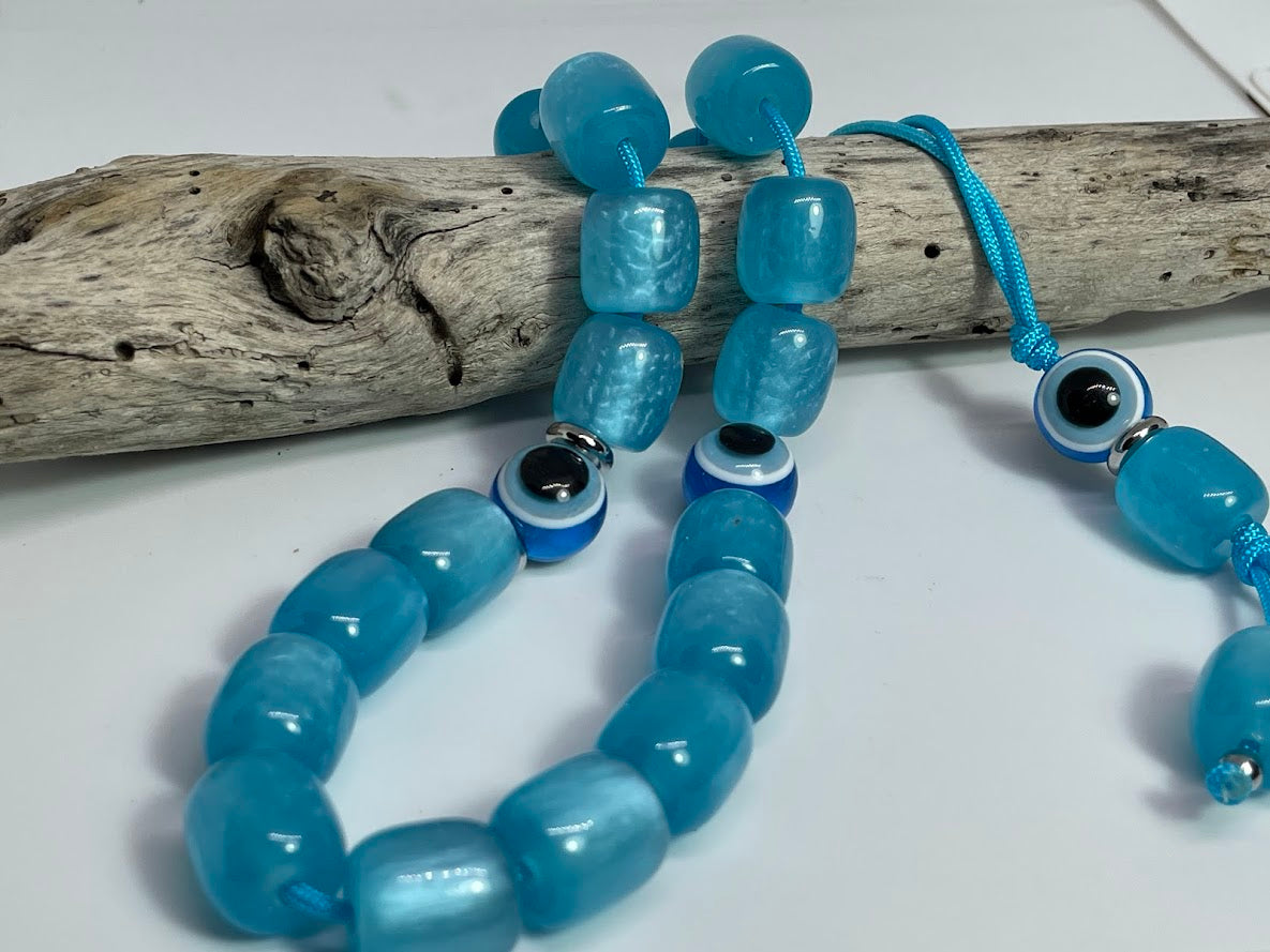 This Turquoise Evil Eye Worry Beads, a treasured Greek gift that combines tradition and protection. Handcrafted with care, these worry beads feature turquoise barrel acrylic beads, each carrying the potent symbolism of the Evil Eye to ward off negativity. Measuring approximately 30cm (11.80 inches) in length, this Greek Komboloi is a tangible reminder of ancient wisdom.