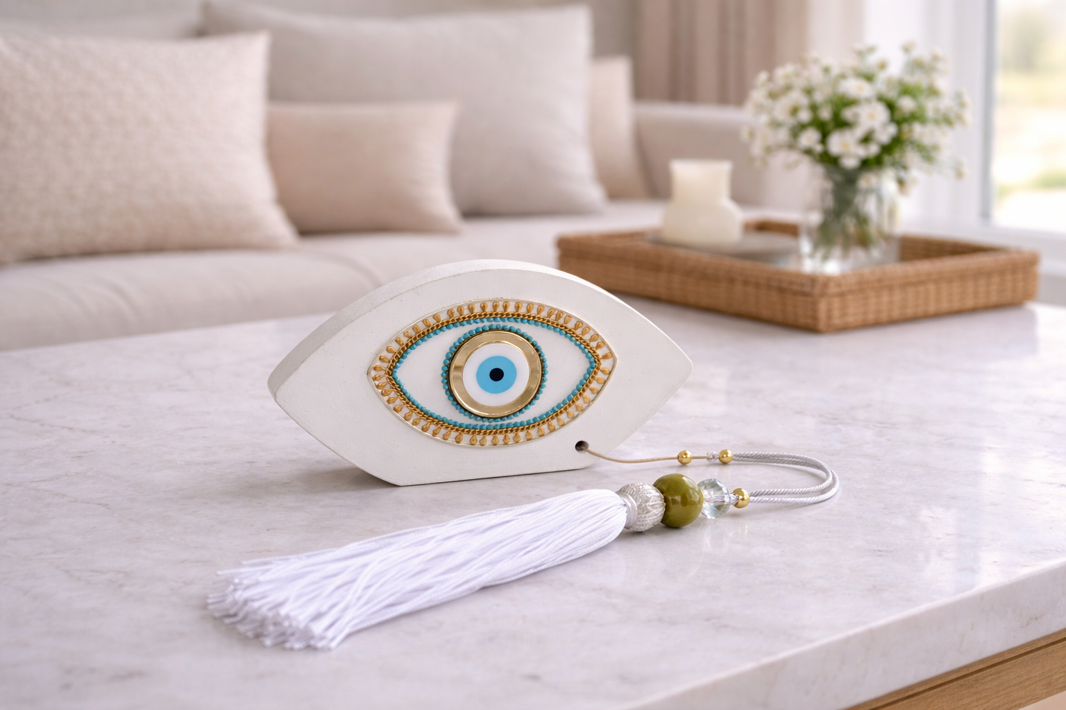 White Wooden Evil Eye Charm – Wall Hanging or Table Decoration - House Protection, Greek Gift Idea