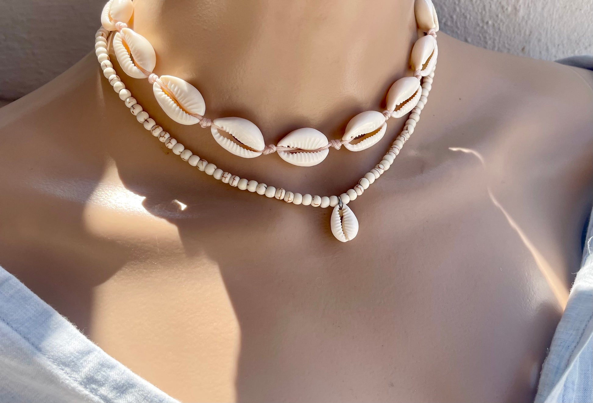 This necklace features cowrie natural shell beads mounted on a cord and adjustable to most sizes.