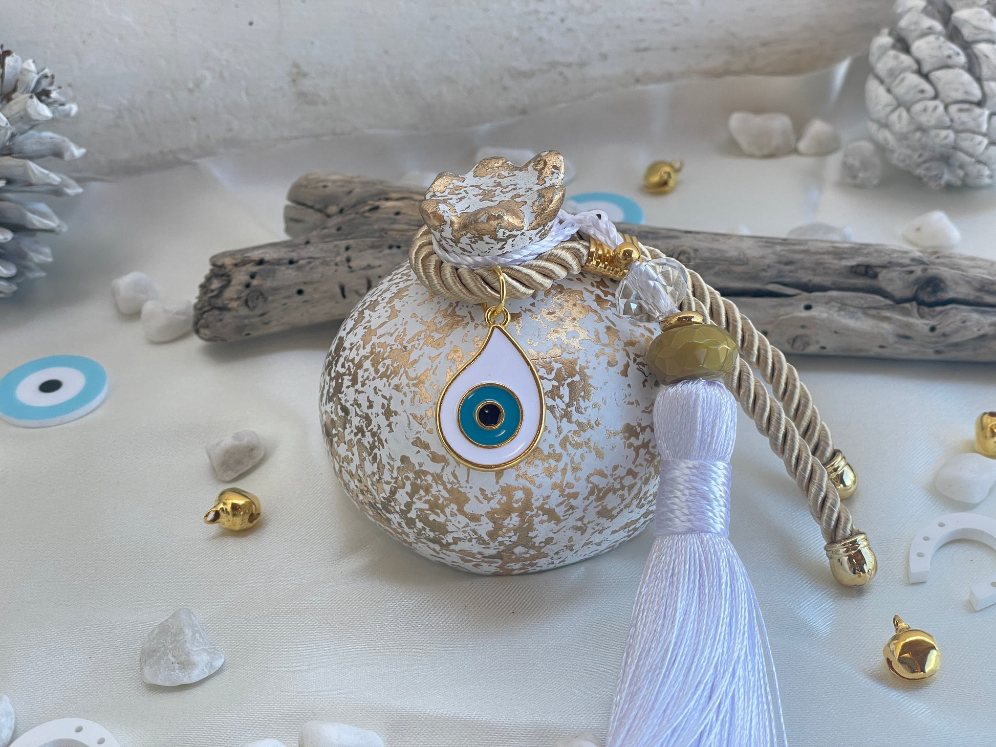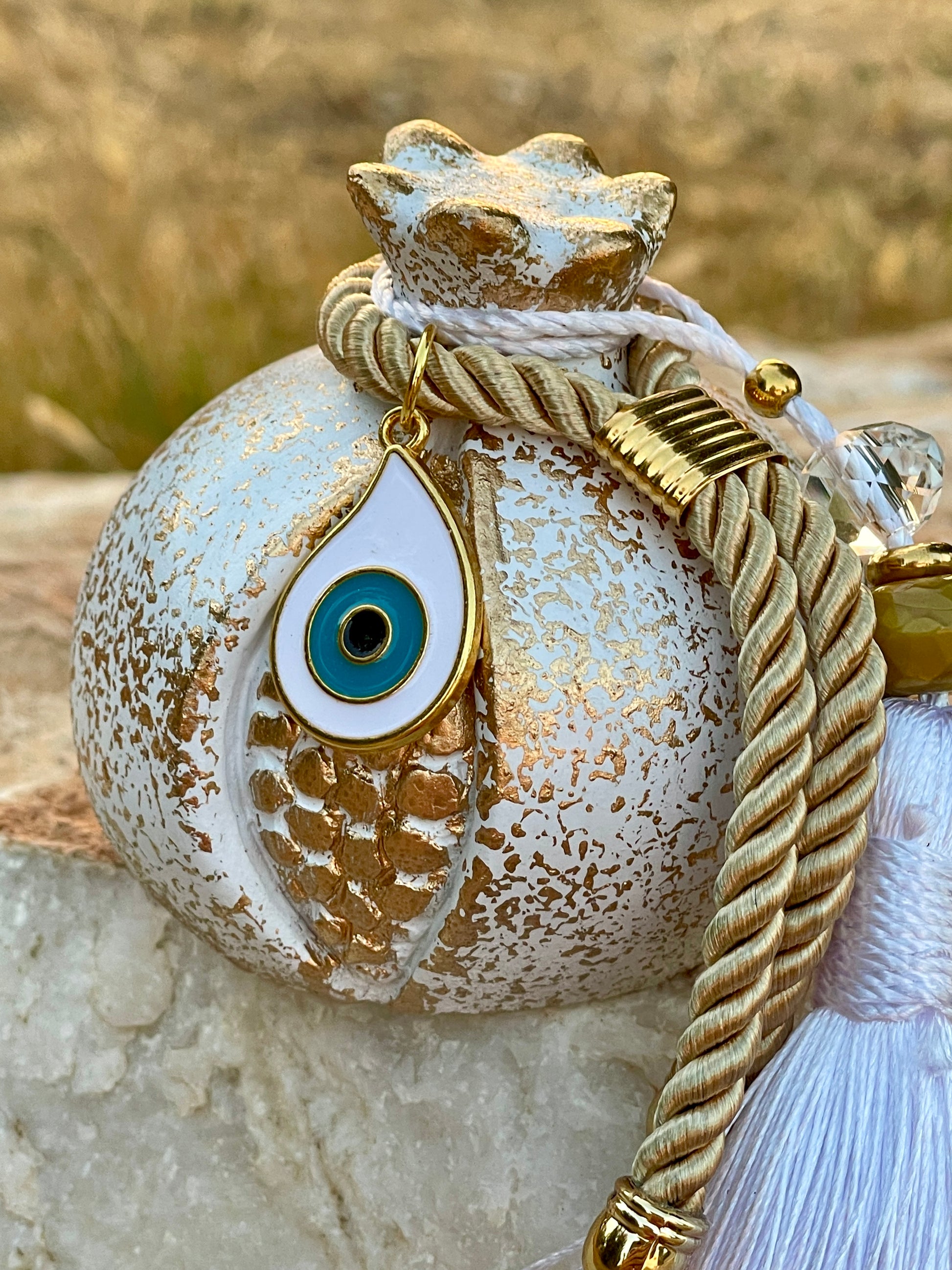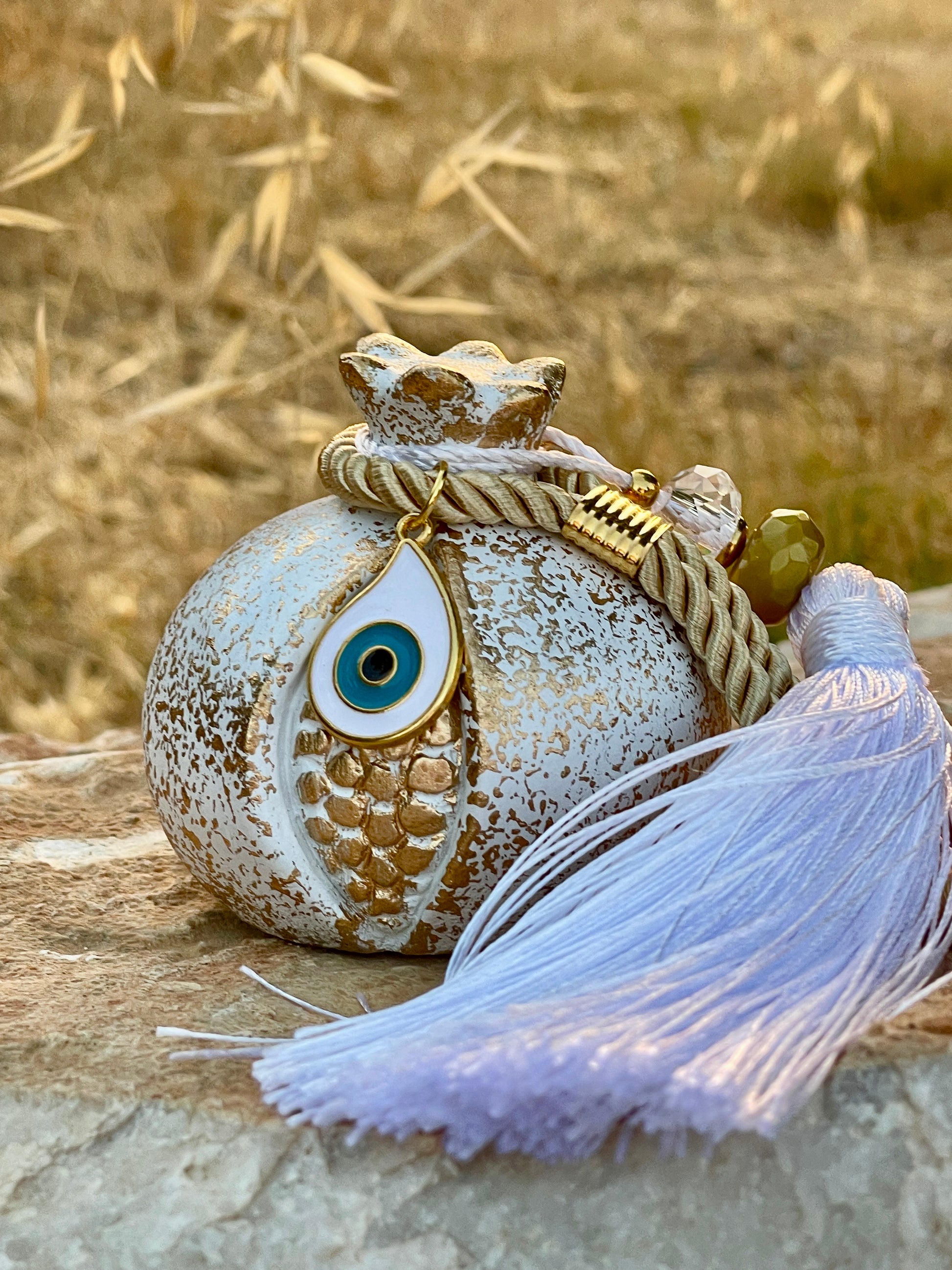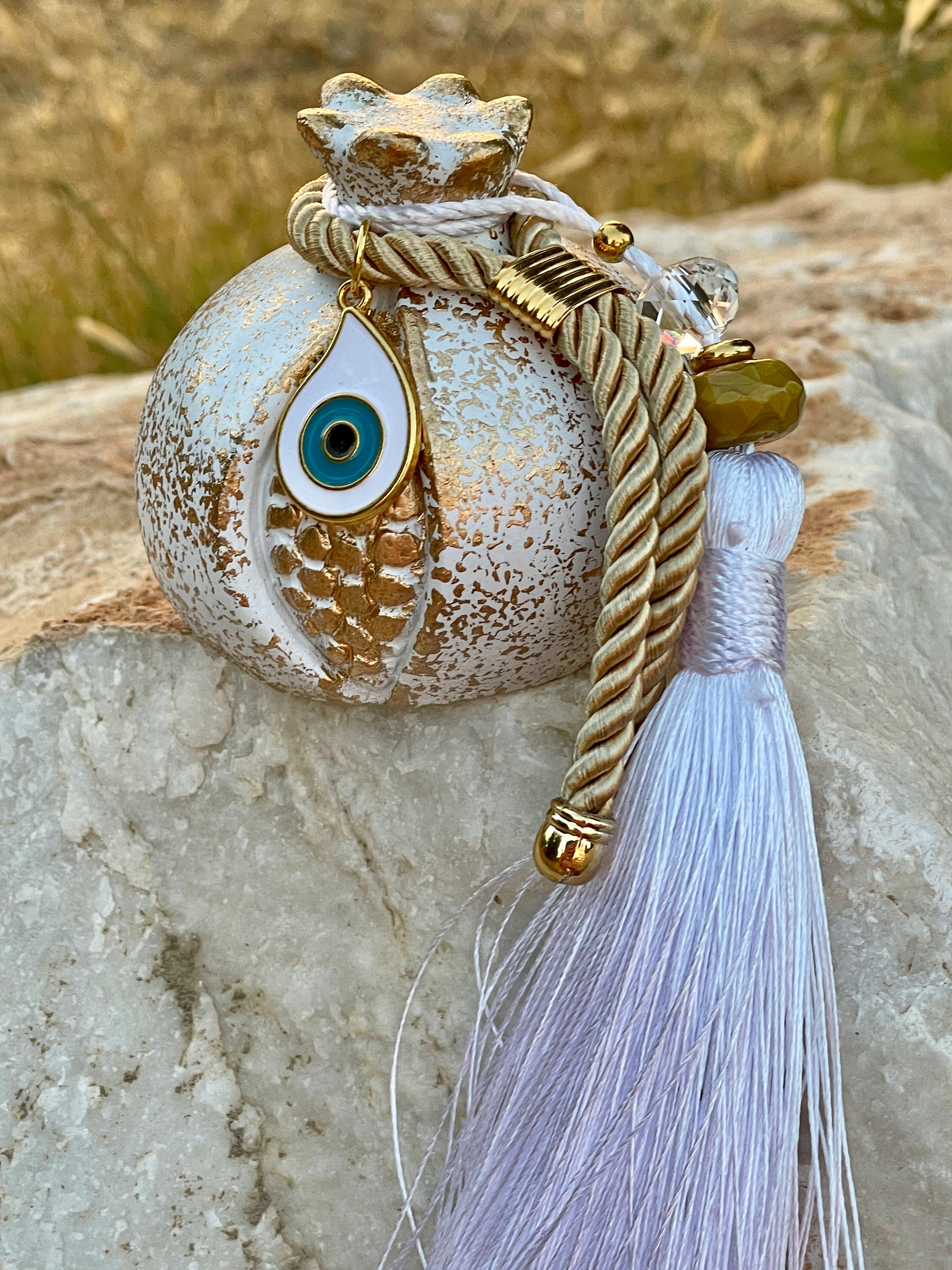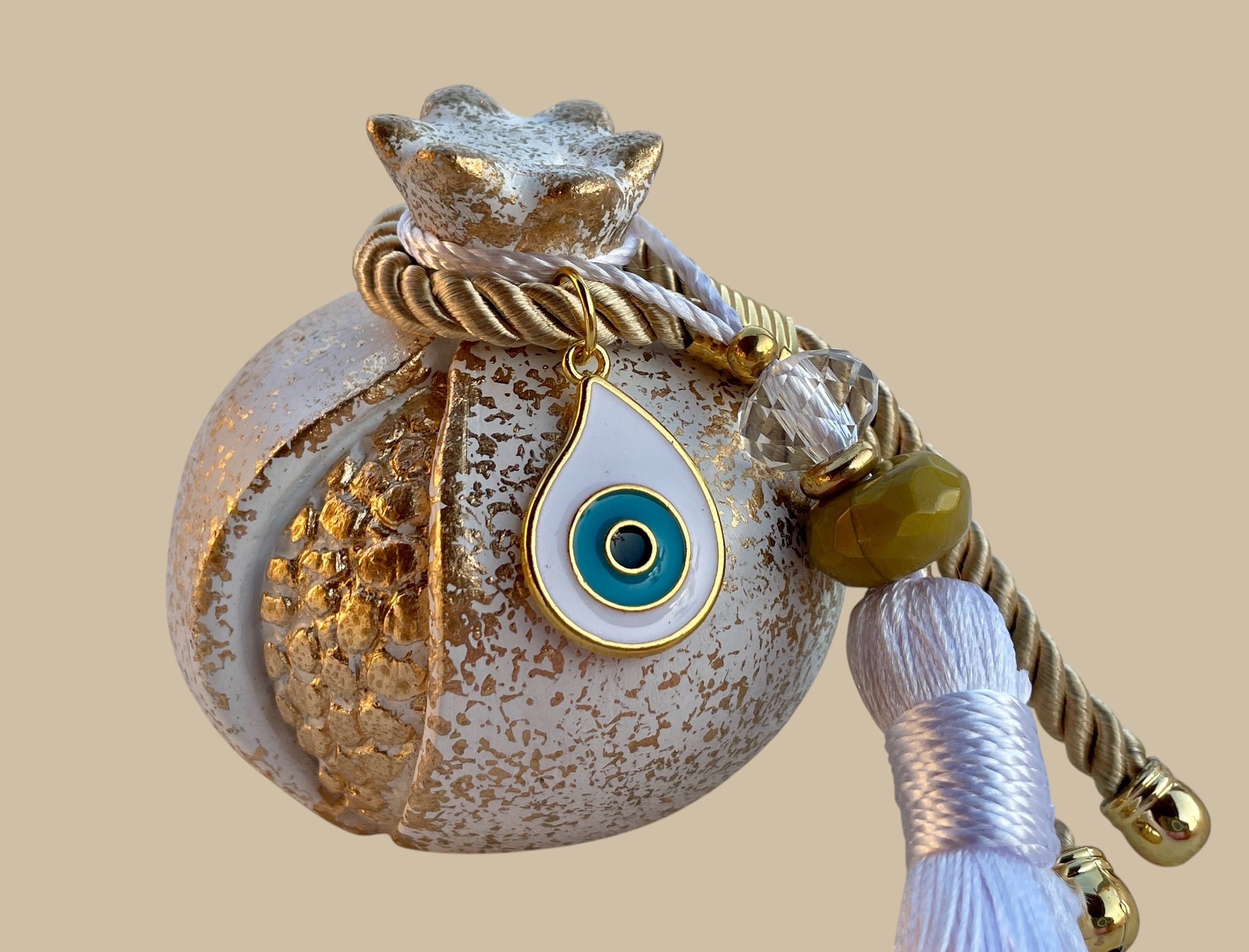 Elevate your décor with this elegant ceramic pomegranate, a timeless symbol of prosperity and good fortune. Handcrafted with a refined white and gold finish, this unique piece is adorned with a golden evil eye charm for protection and positive energy. A white tassel, is enhanced with crystal & acrylic beads.