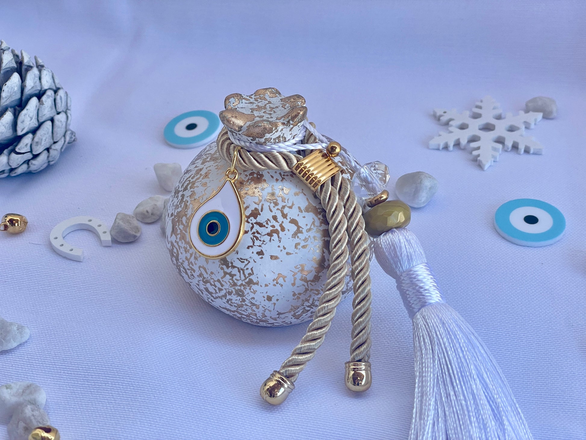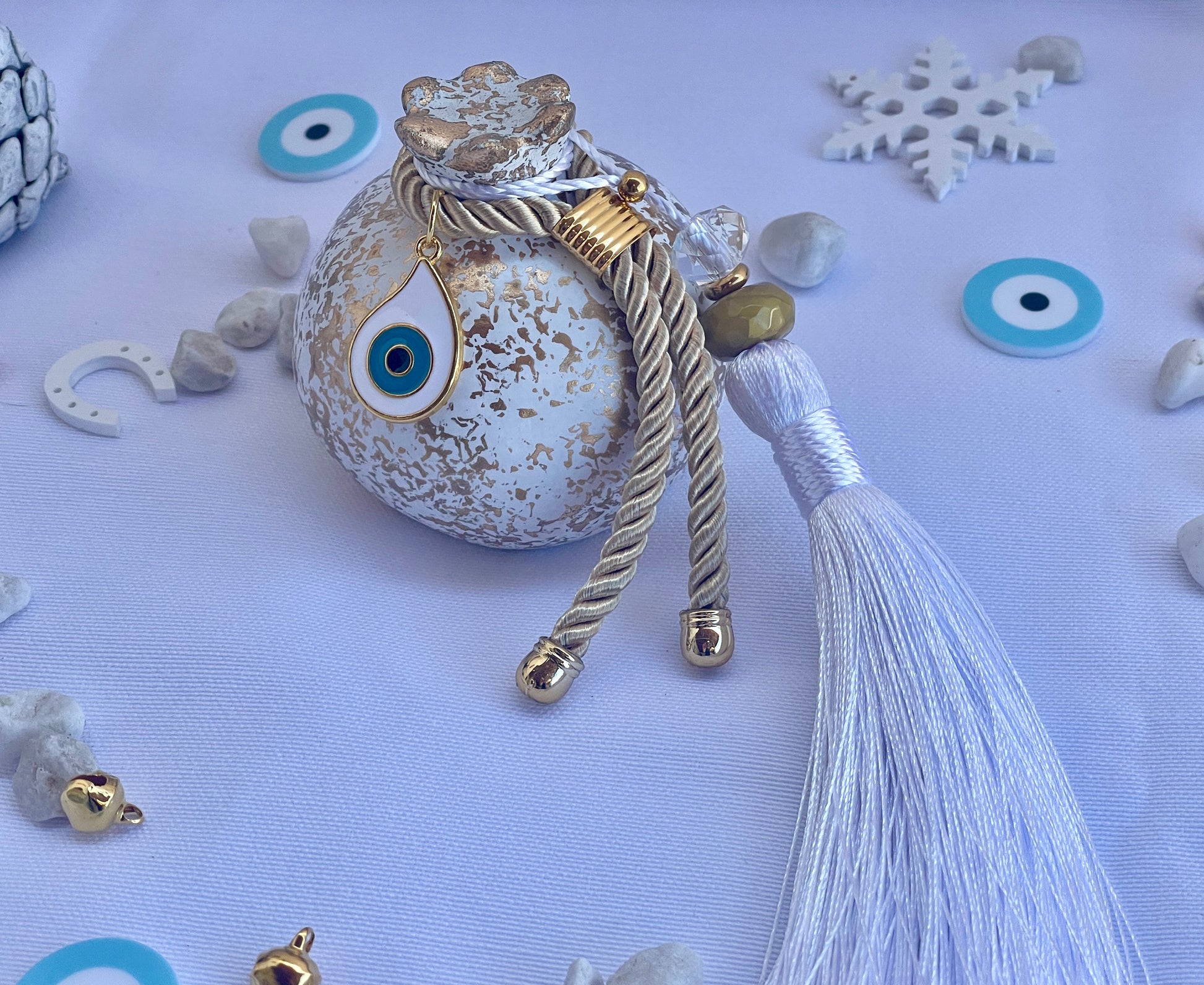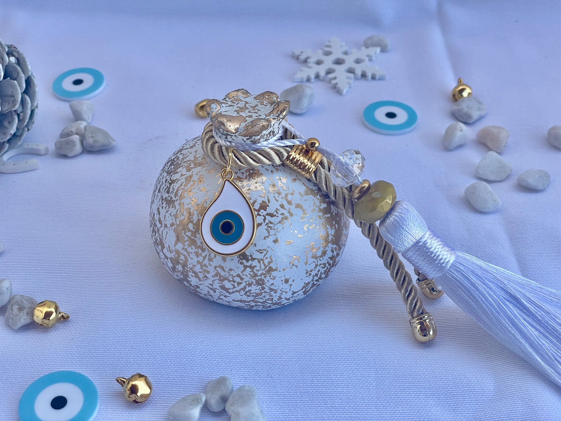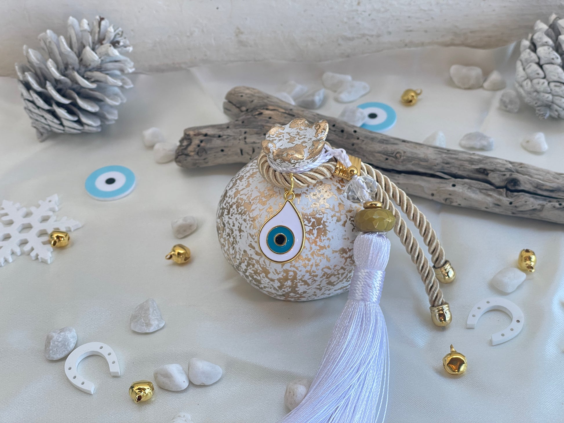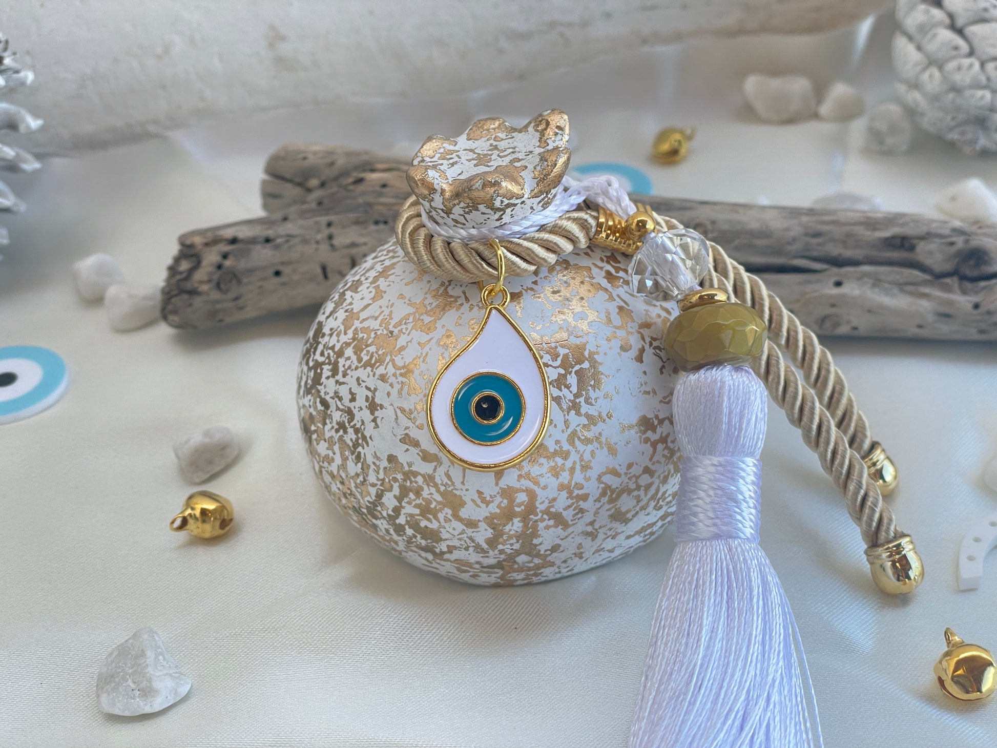 Elevate your décor with this elegant ceramic pomegranate, a timeless symbol of prosperity and good fortune. Handcrafted with a refined white and gold finish, this unique piece is adorned with a golden evil eye charm for protection and positive energy. A white tassel, is enhanced with crystal & acrylic beads.