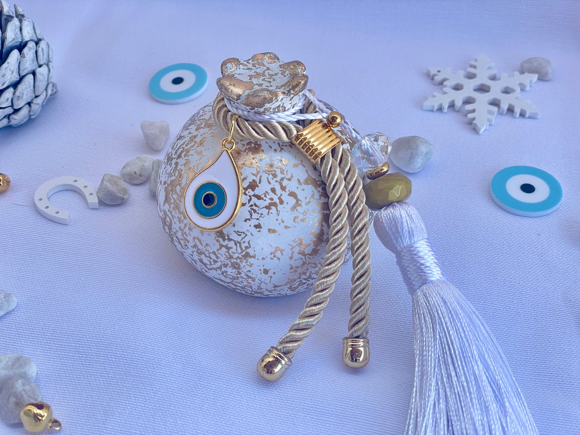 Embellished with a long tassel (12 cm), a braided cord and an evil eye Charm.