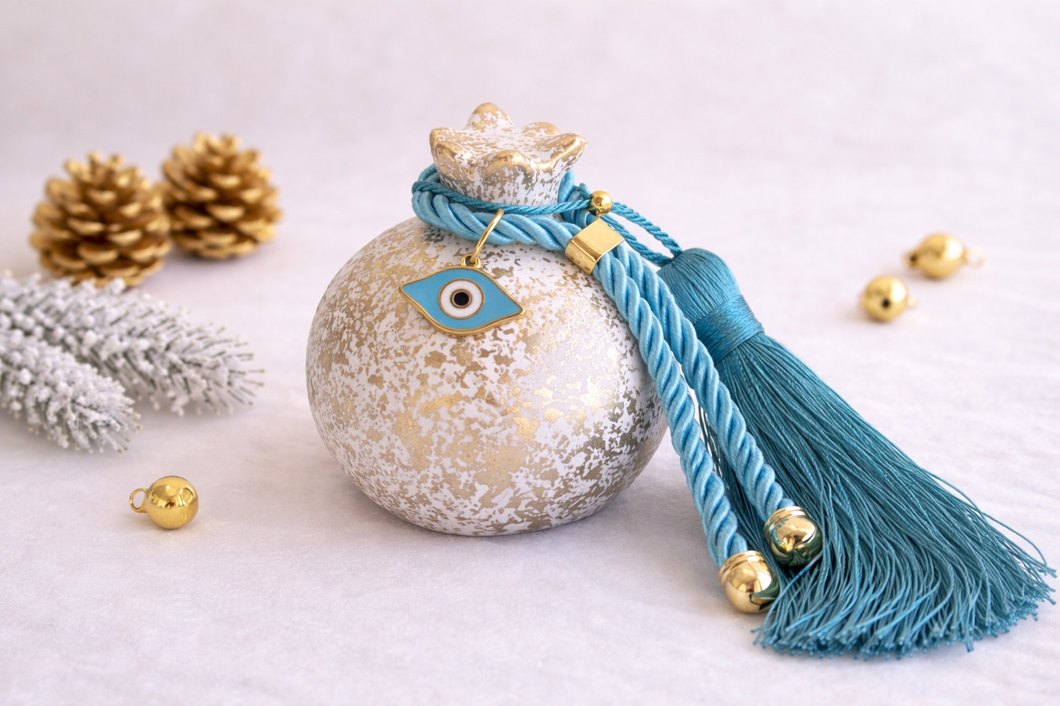 Evil Eye Ceramic Pomegranate with Tassel - Greek Gouria - New Year Gift