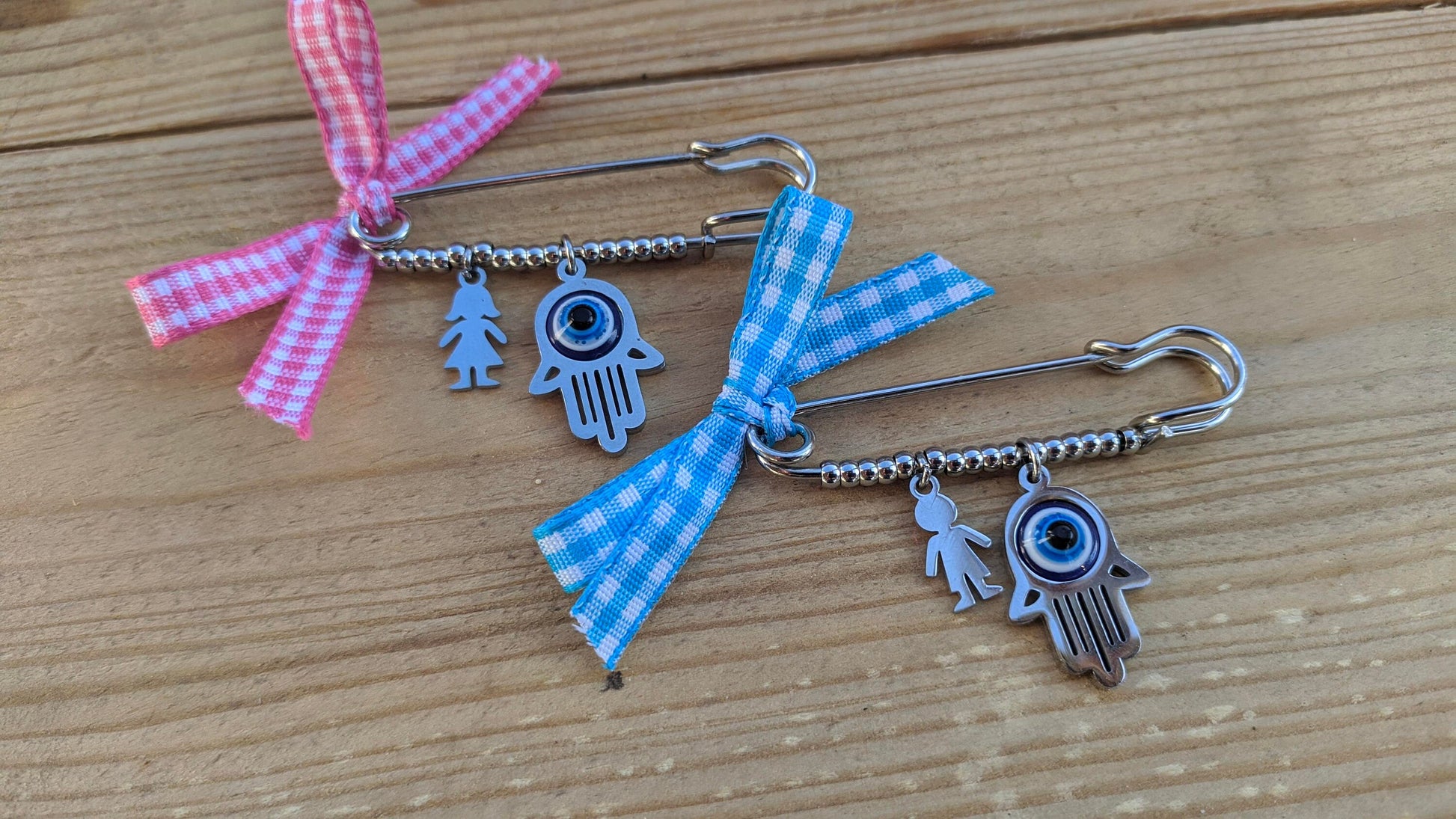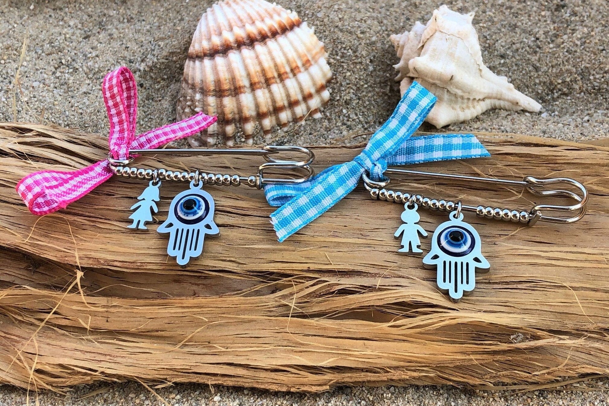 Beautiful handmade safety pin, baby charm for baby boy or baby girl. Made with a hamsa hand charm and a tiny boy or girl charm. All the components are made from stainless steel. Will never tarnish. Quality product.