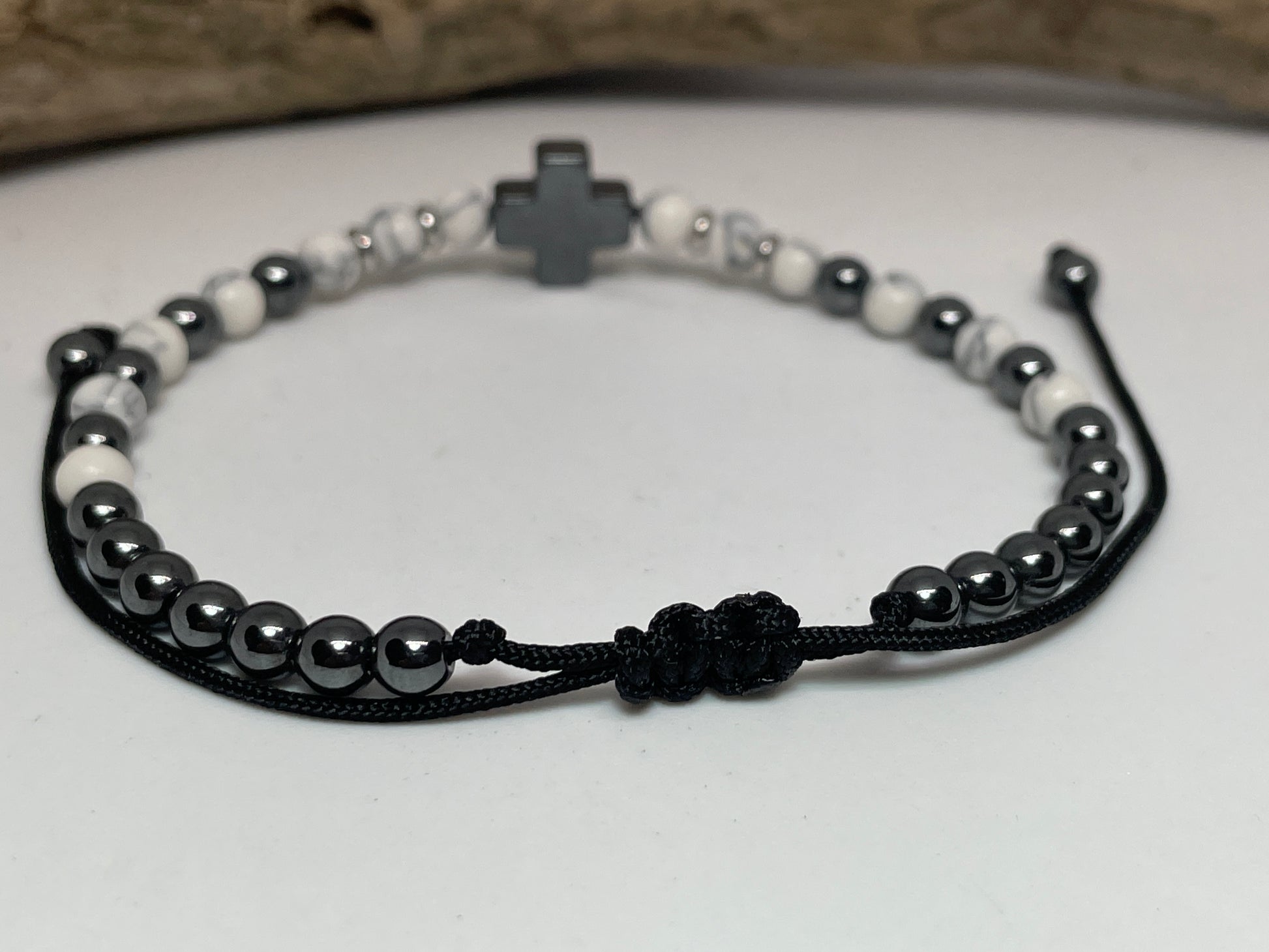This elegant men’s bracelet features a 10mm hematite cross, beautifully accented with hematite beads and 4mm semi-precious stones. Each bead adds a unique touch of natural character, making this bracelet both stylish and meaningful.