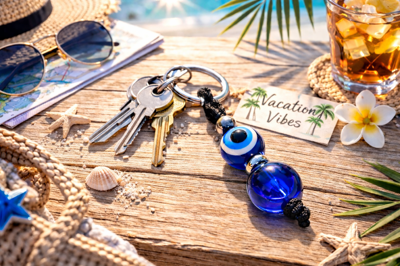 Add a Mediterranean touch to your everyday essentials with this beautiful evil eye keychain, a traditional symbol of protection and good fortune.