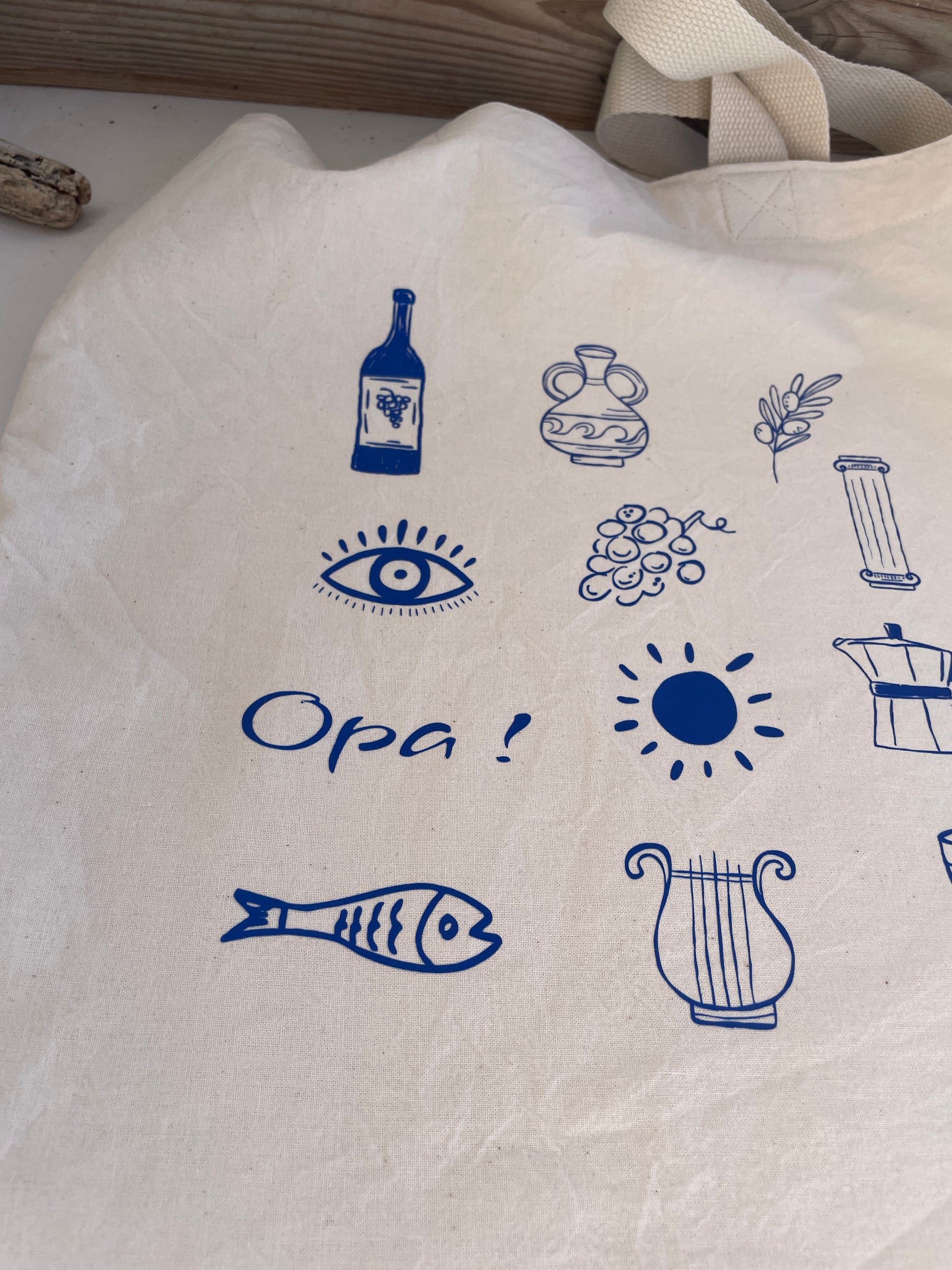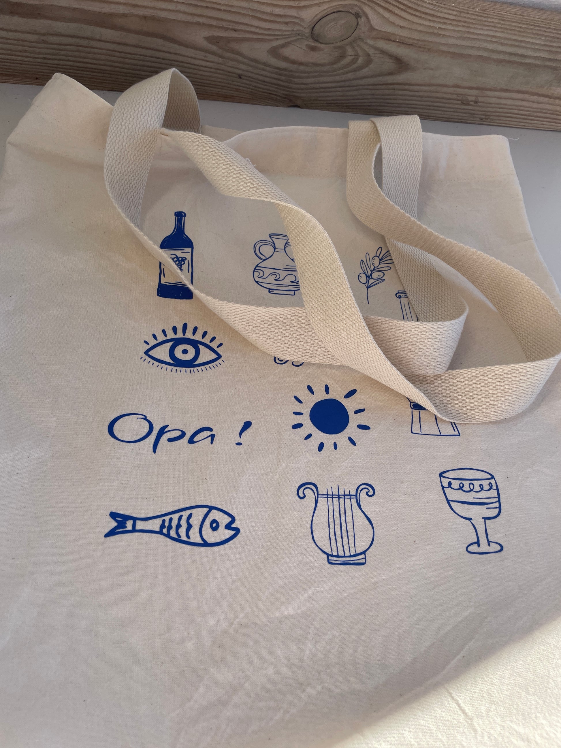Bring a touch of Greece everywhere you go with this beautifully illustrated tote bag featuring iconic Greek symbols. The blue designs capture the essence of Mediterranean life: olive branches, amphora, Greek eye, sunshine, wine, fish, and the joyful “Opa!” spirit. Lightweight and easy to carry, this tote is perfect for everyday use — whether for shopping, travel, beach days, or your daily essentials. Its soft natural cotton and Cycladic-inspired artwork make it both practical and stylish.