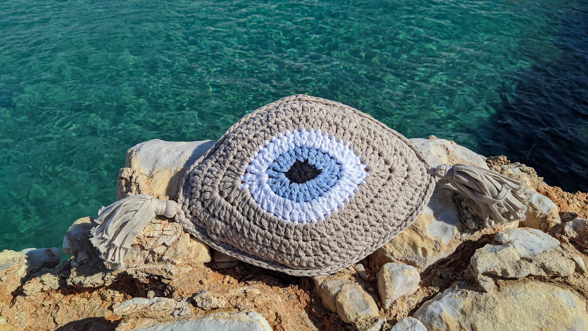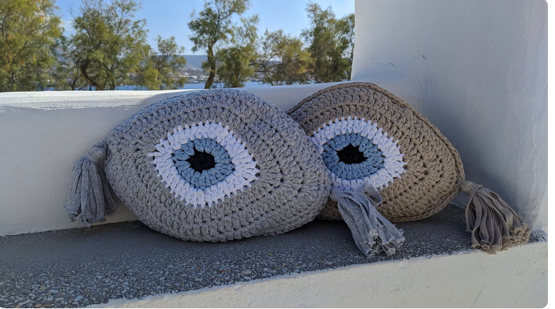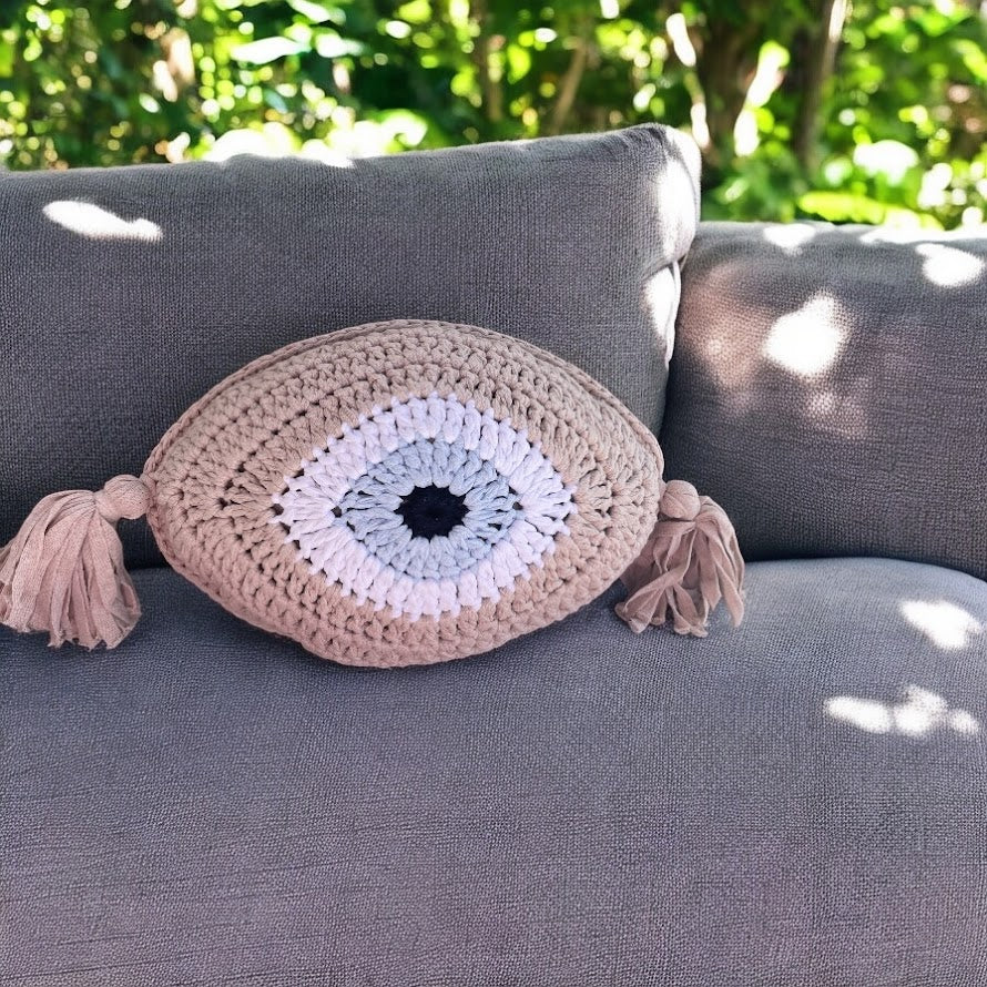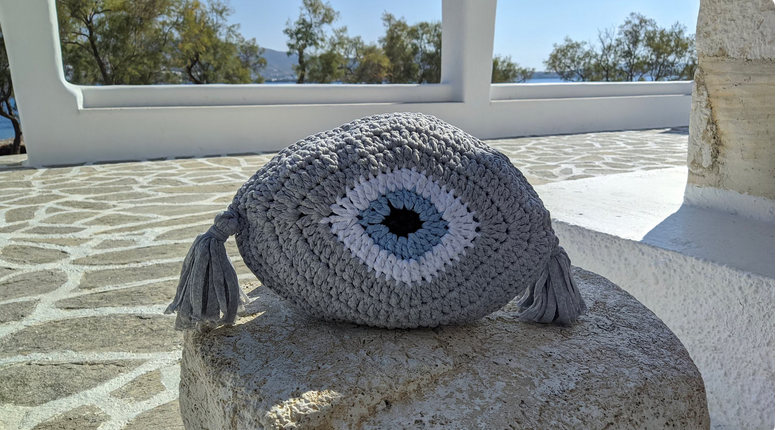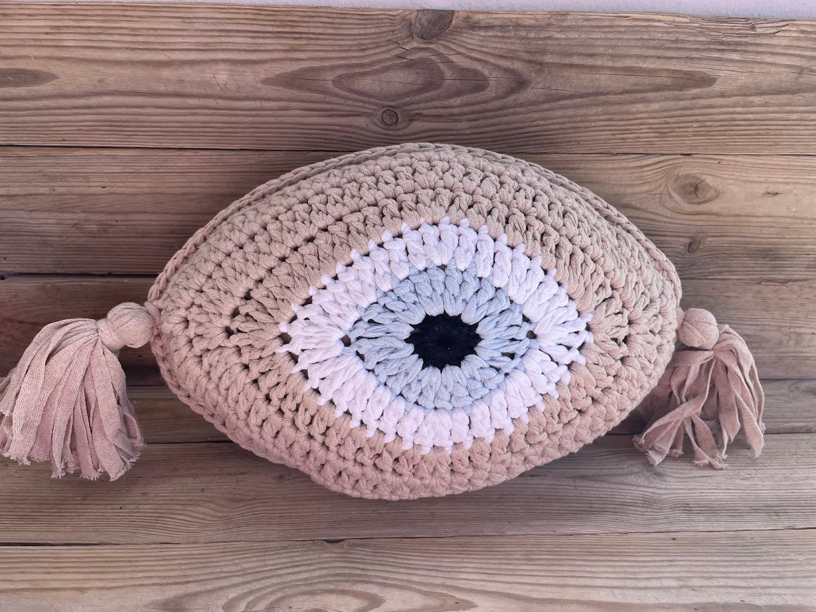 Handmade Cycladic Evil Eye Cushion – Crochet Design with Tassel Details