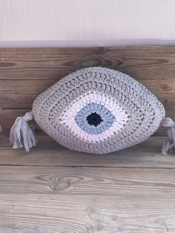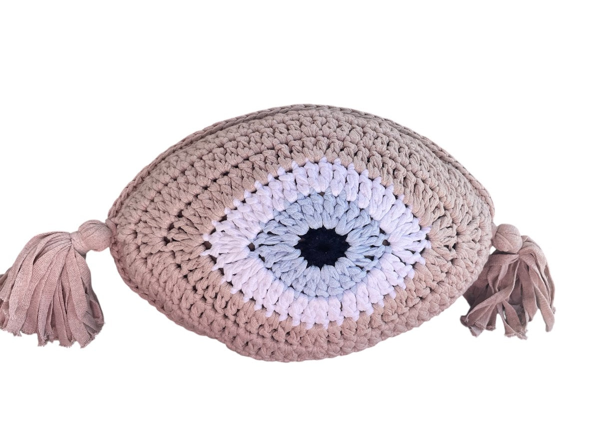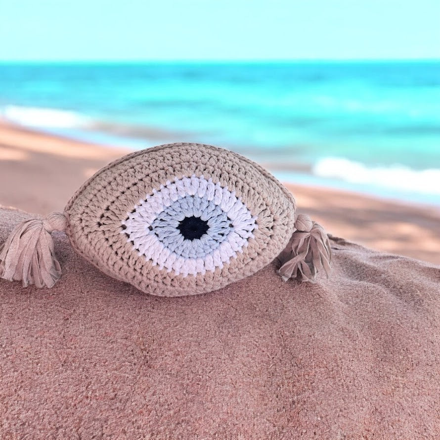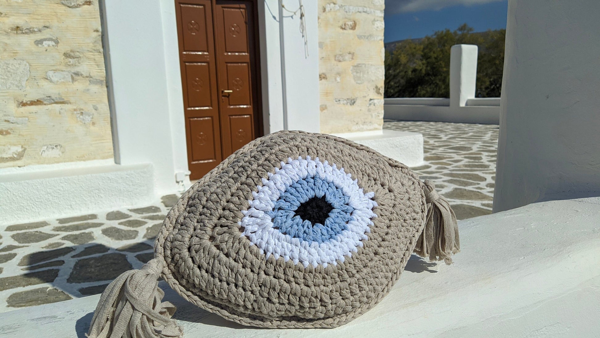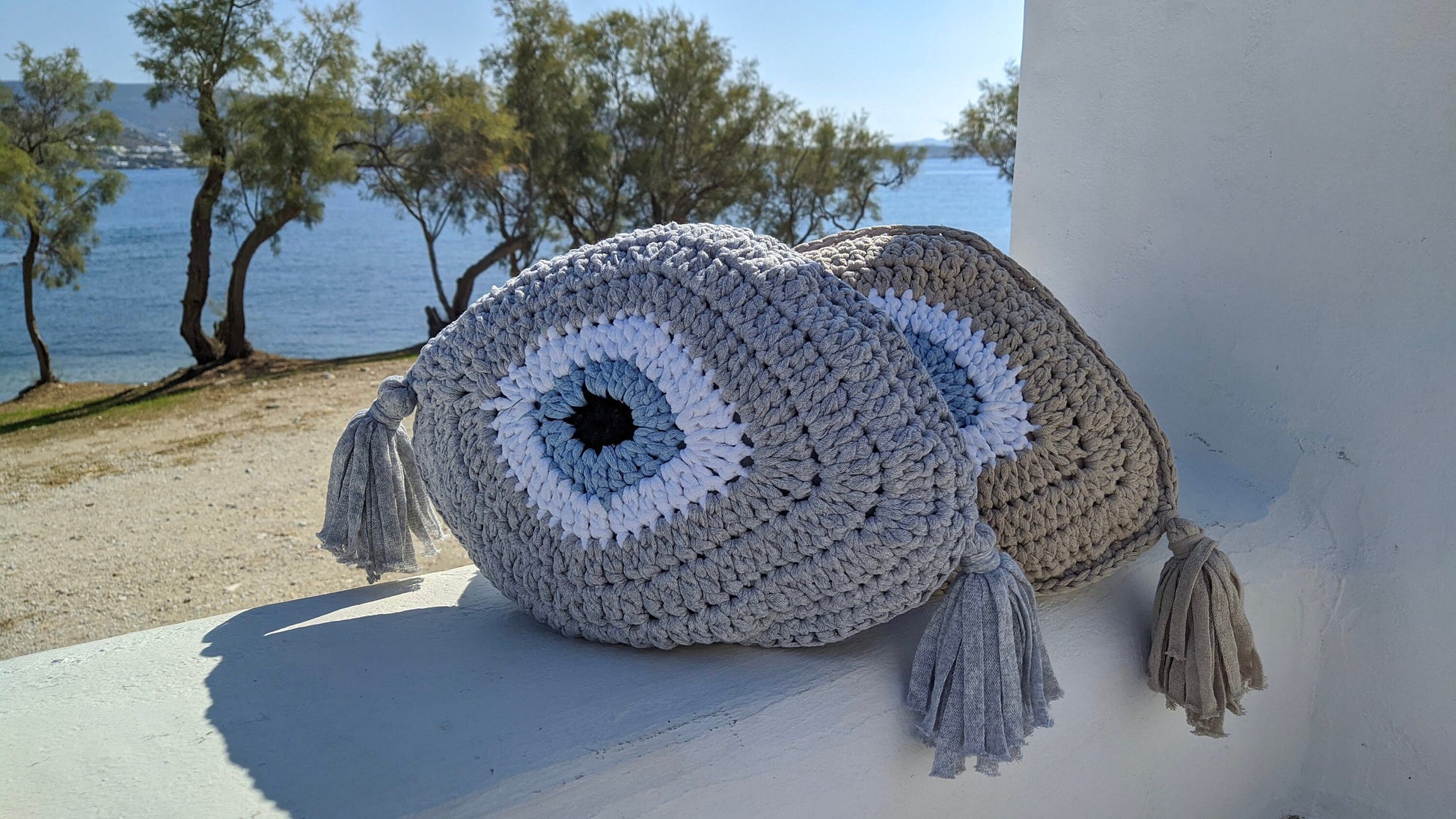 Handmade Cycladic Evil Eye Cushion – Crochet Design with Tassel Details