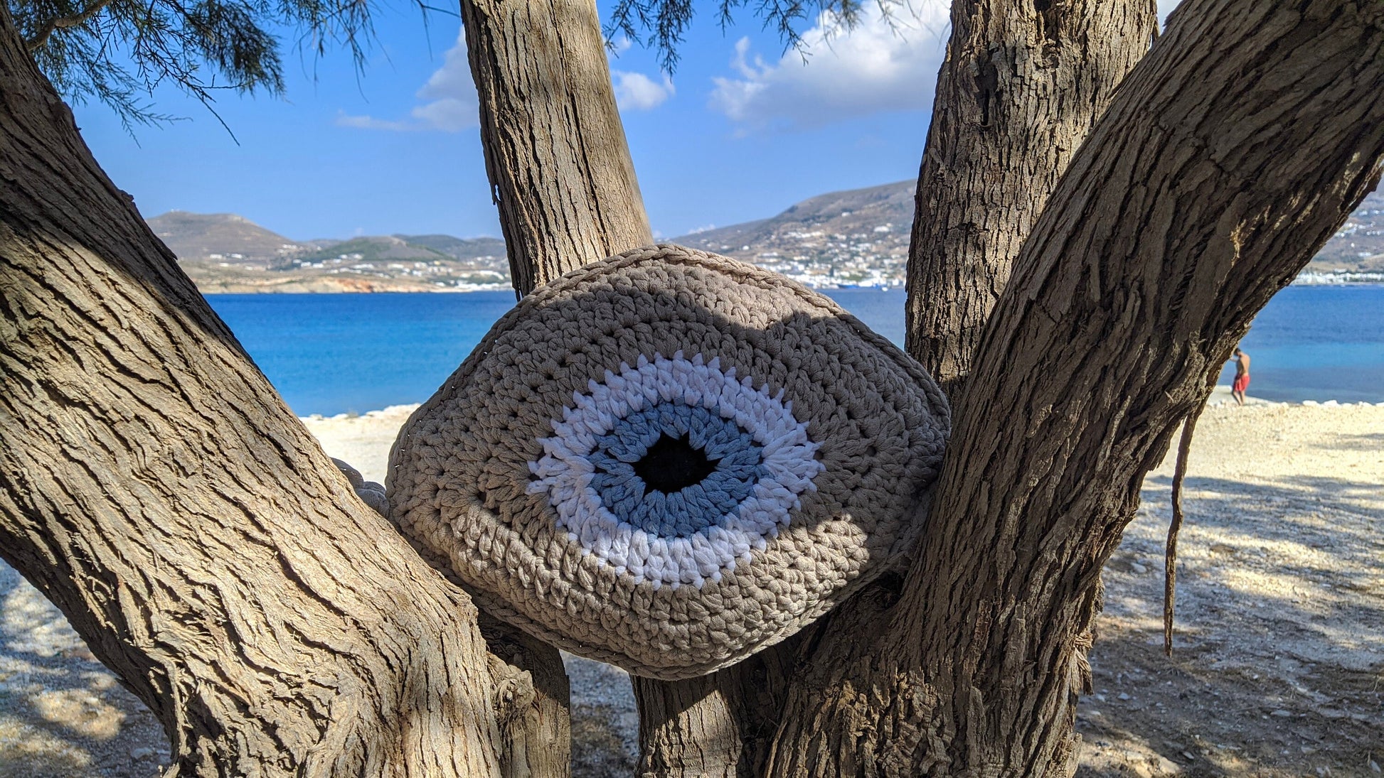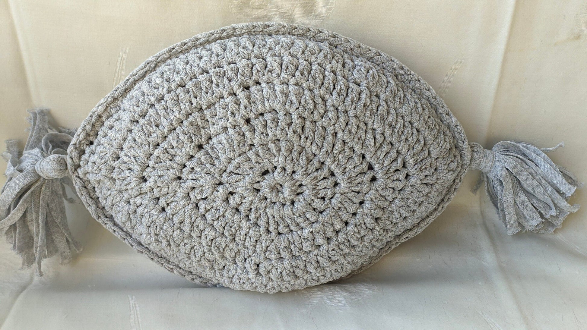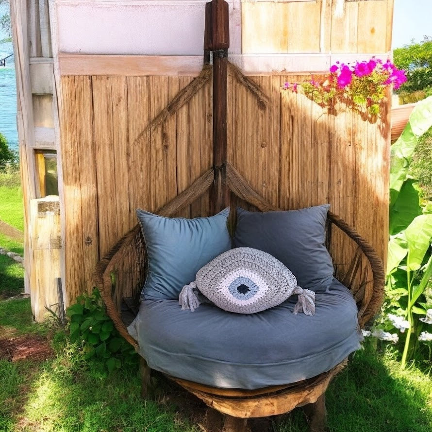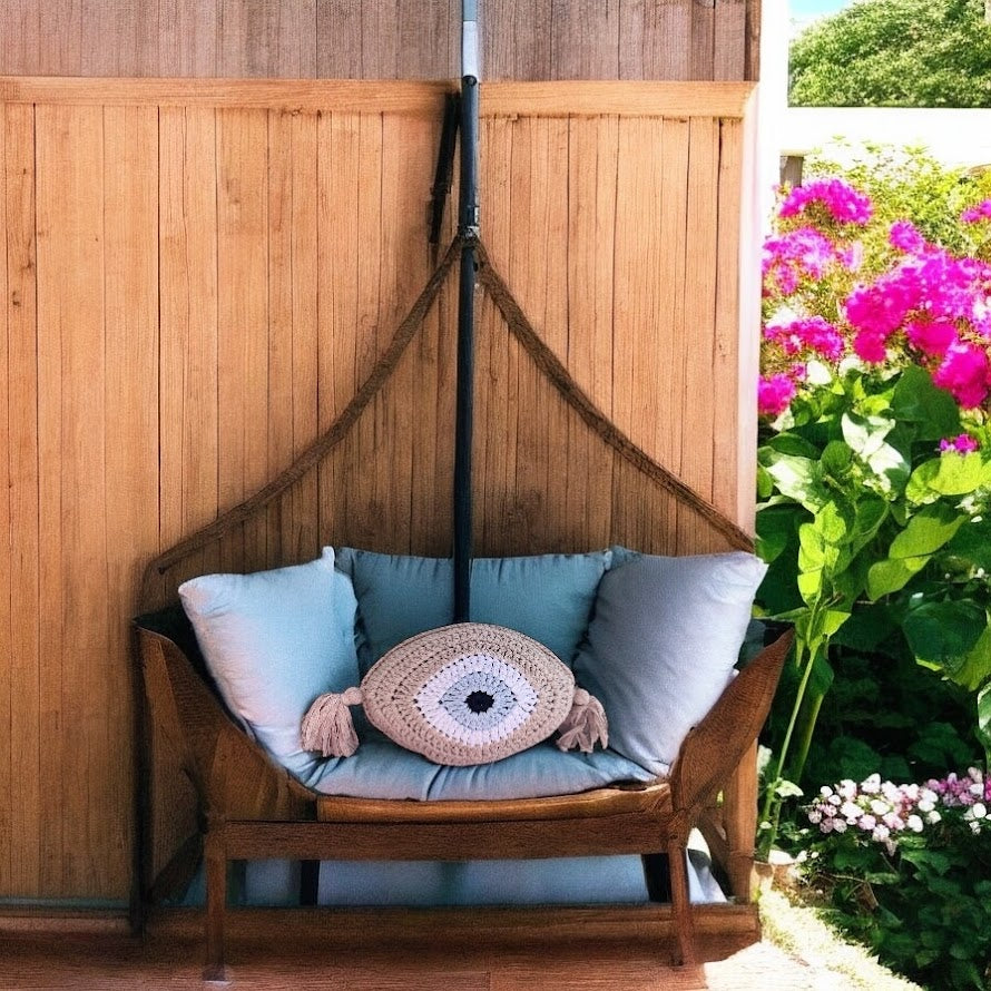 Handmade Cycladic Evil Eye Cushion – Crochet Design with Tassel Details