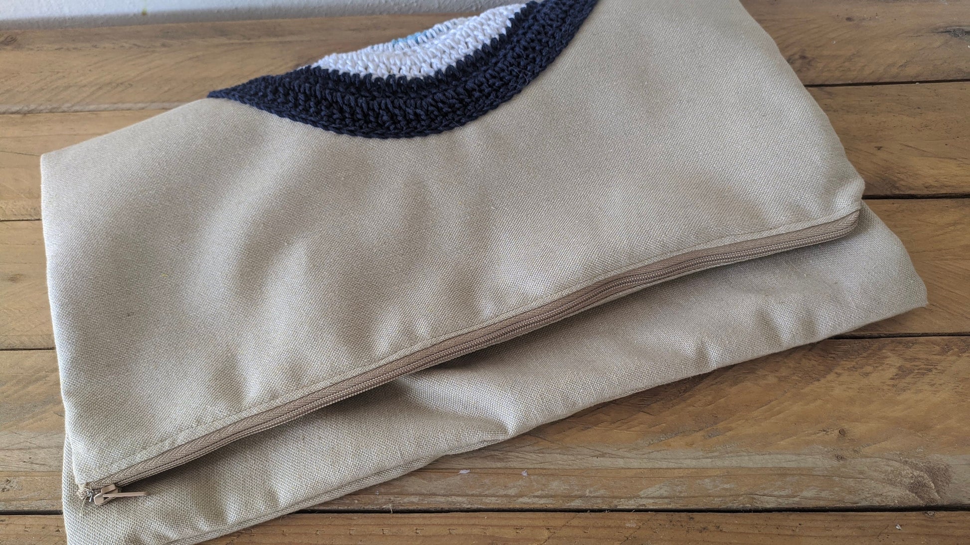 This cushion cover has been made with a beige cotton fabric and decorated with a crocheted evil eye. The evil eye is only on one side. The listing is for a cushion cover (cushion not included).