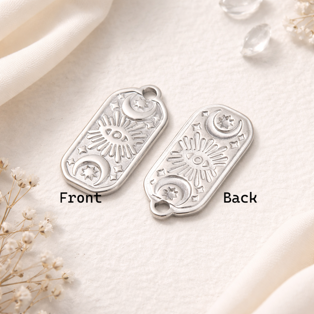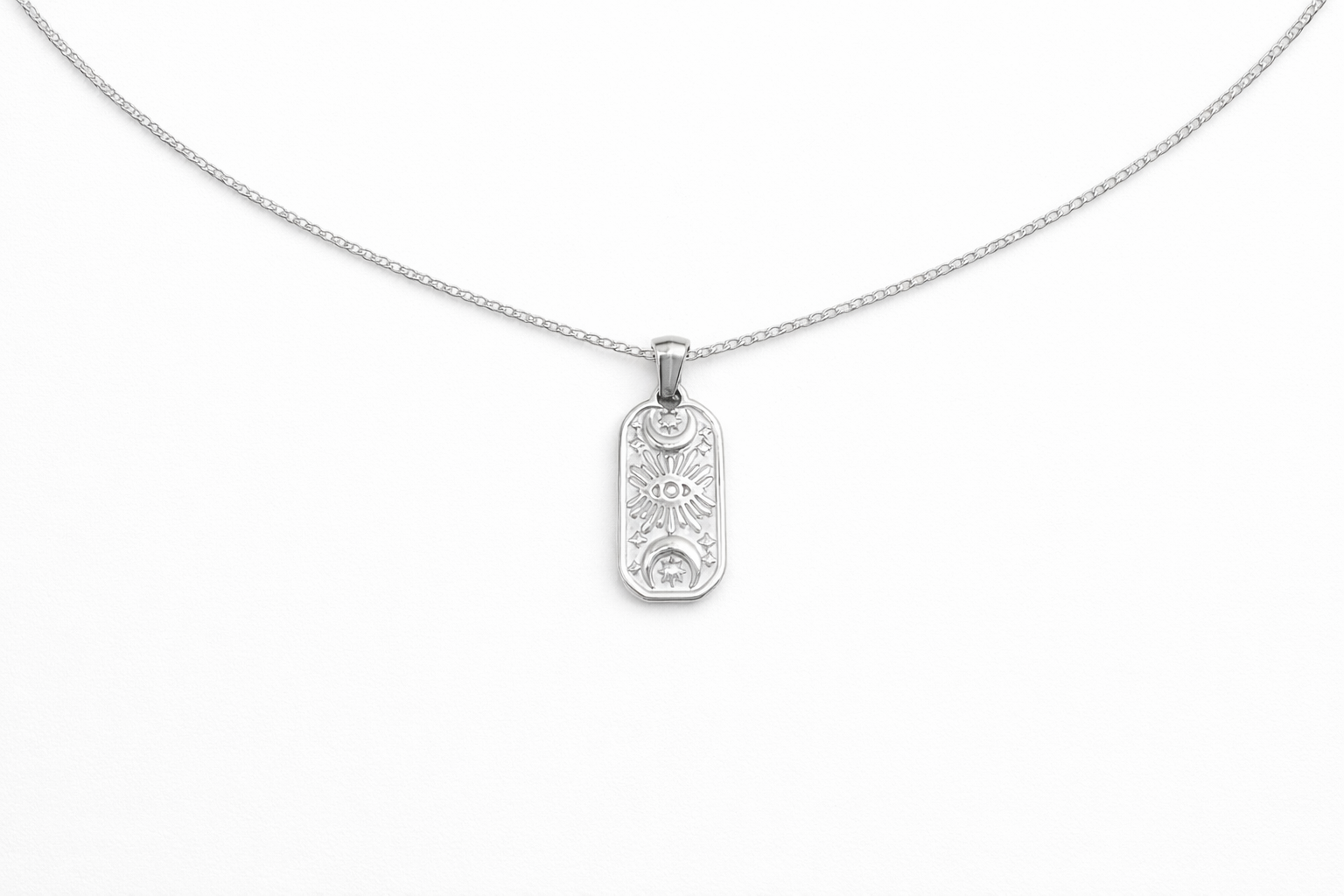 Add a touch of mystery and symbolism to your style with this elegant stainless steel necklace. The rectangular pendant features a finely engraved all-seeing eye, accompanied by two crescent moons and delicate stars, creating a celestial and spiritual design that is both meaningful and timeless.