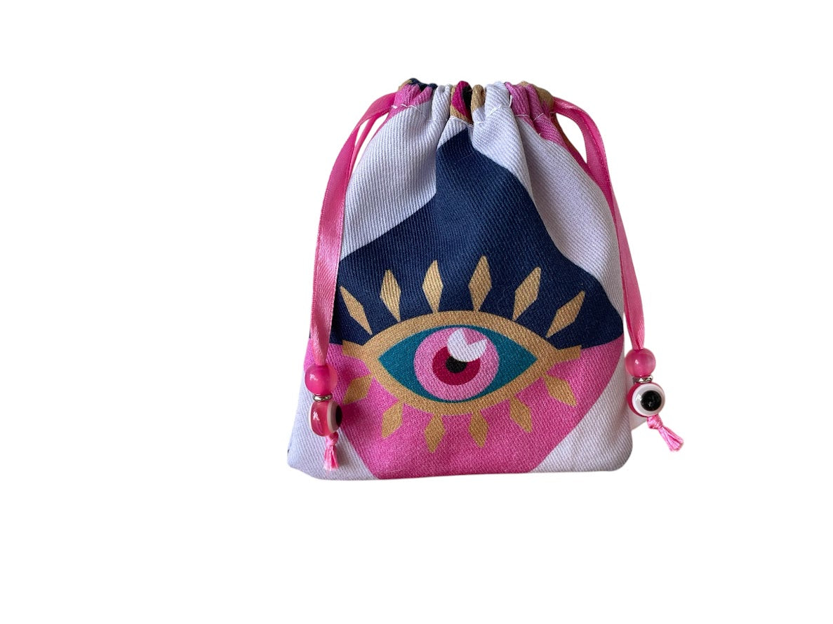 Add a touch of charm and protection to your everyday essentials with our Evil Eye Fabric Drawstring Bags decorated with a delicate evil eye charm for extra protection. Featuring vibrant evil eye patterns known for warding off negative energy. These bags are perfect for gifting, organizing, or carrying your favorite essentials—infused with positive energy and timeless symbolism.