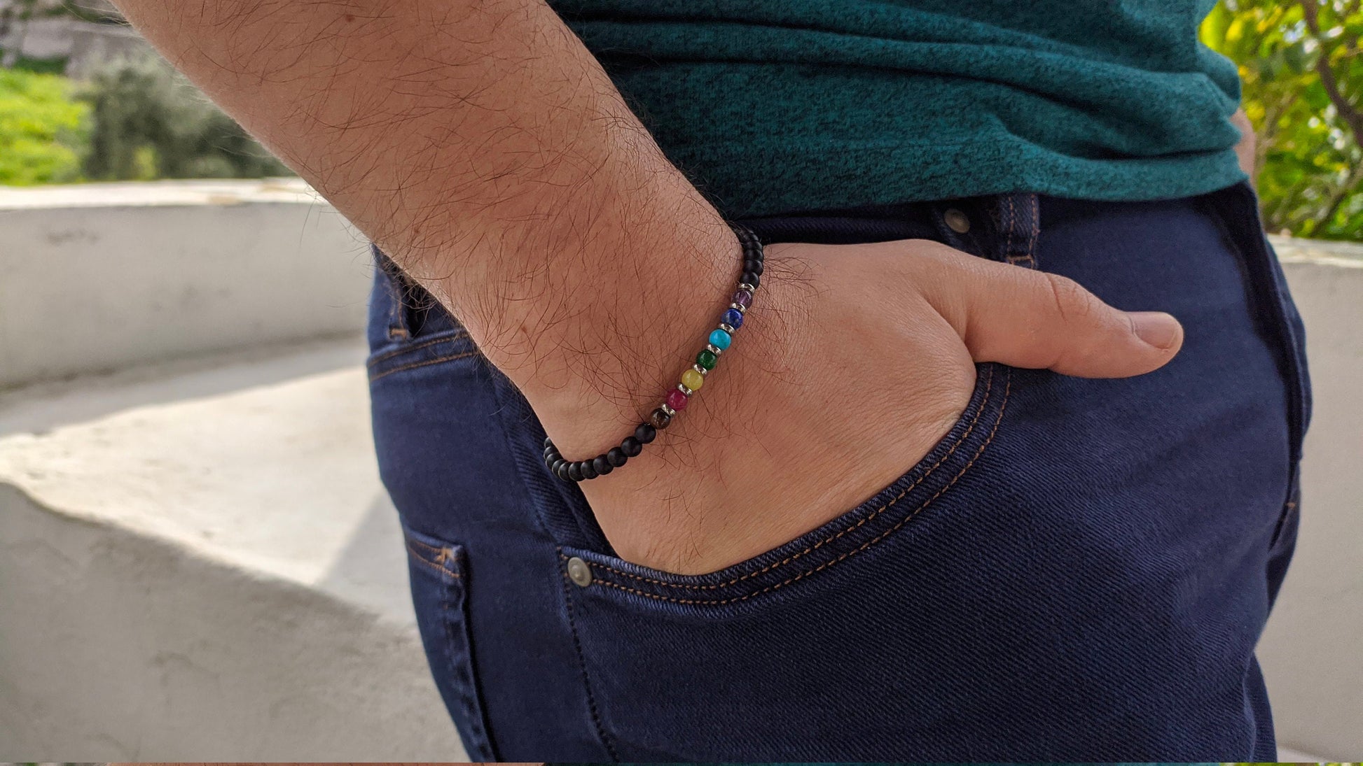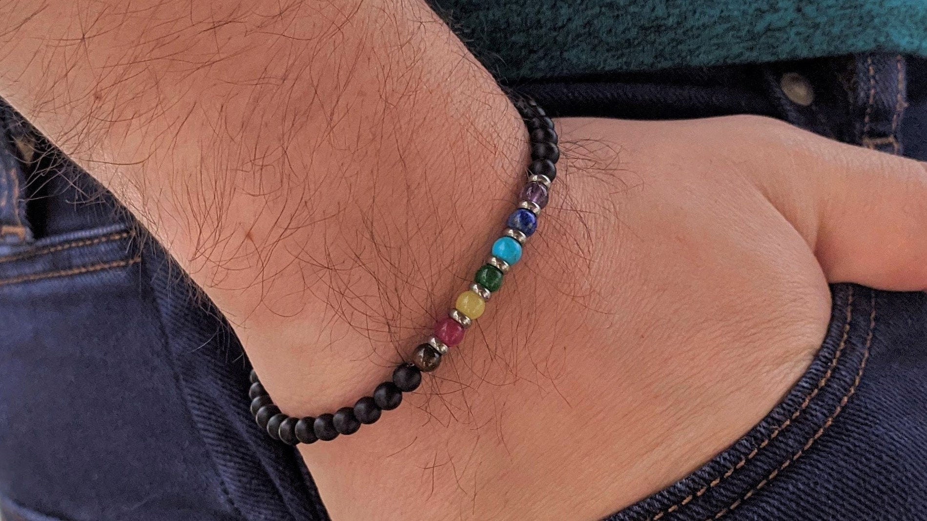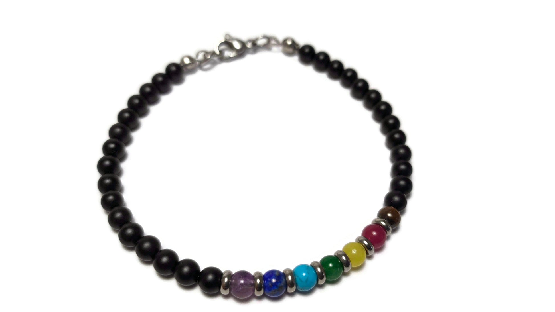 Men's 7 chakra bracelet made with quality 4mm onyx stones and 7 chakra beads. Yoga bracelet, boho tribal bracelet, gift for him or for her