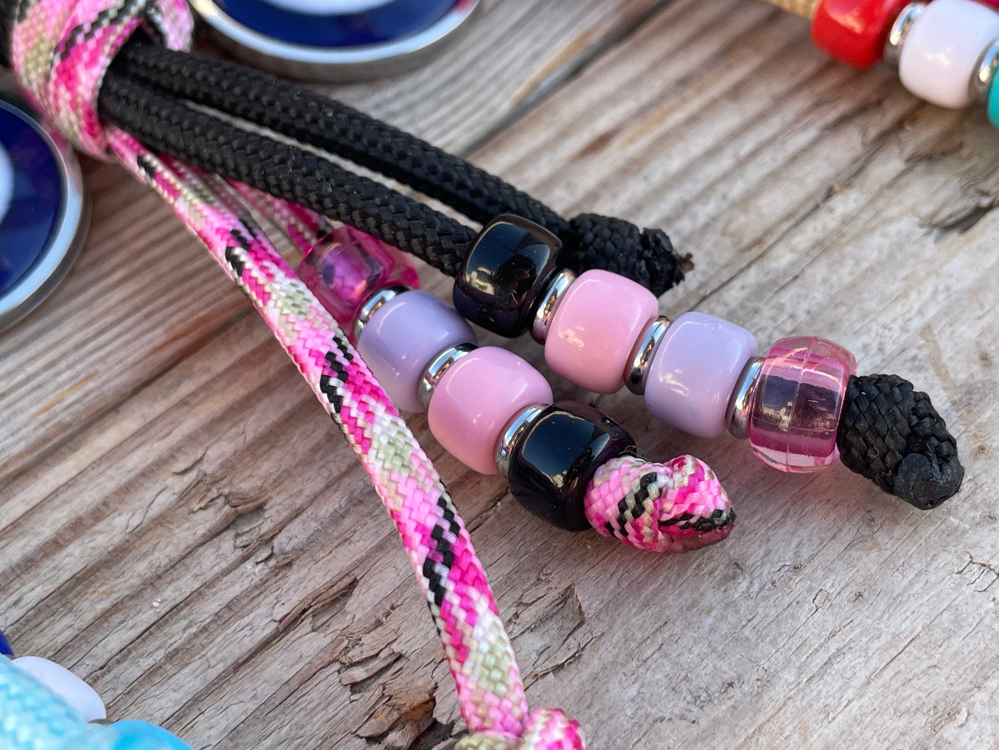 The paracord strands are hand-braided and adorned with colorful pony beads, giving each piece a unique, boho-inspired look. Whether you clip it to your keys or use it as a bag charm, this versatile accessory brings personality and charm wherever it goes.