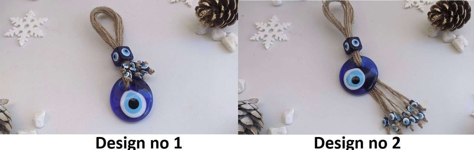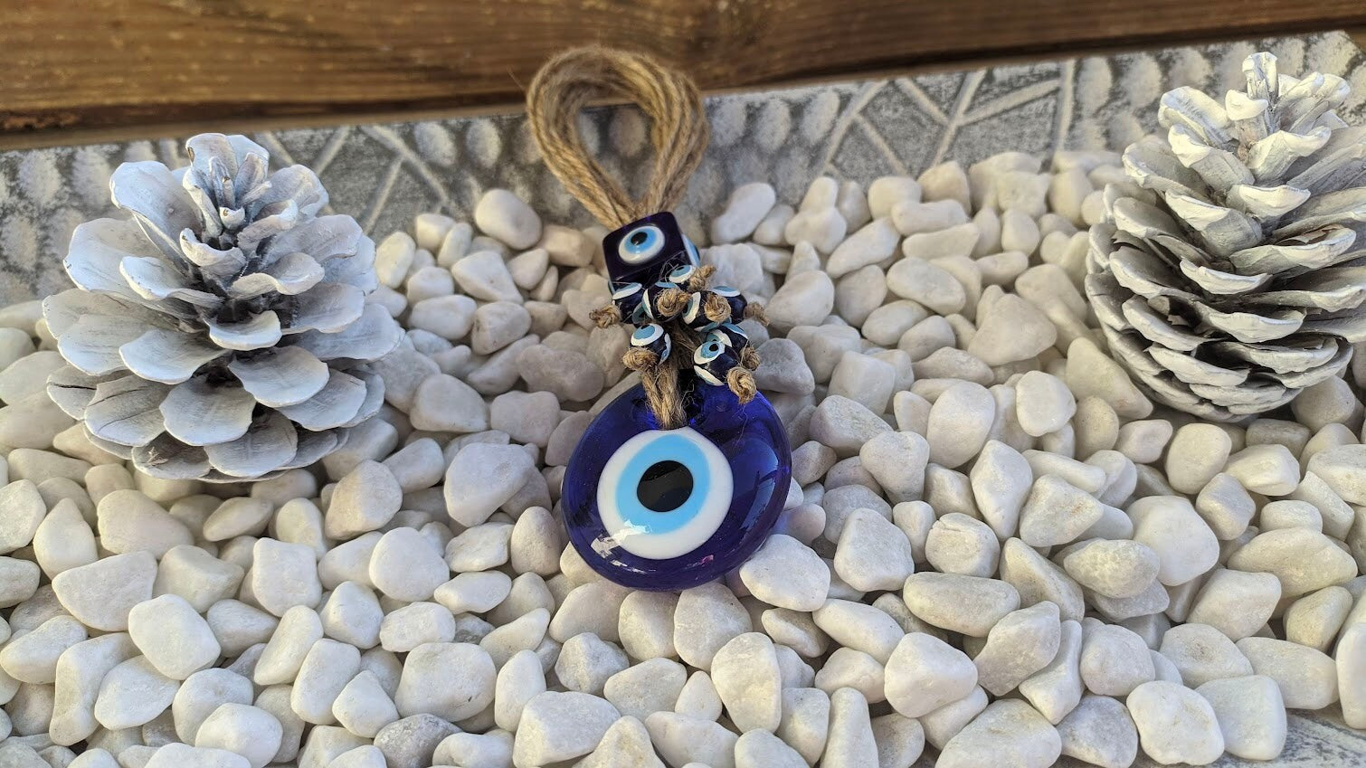 Enhance the protective aura of your home with our Small Evil Eye Wall Hanging. This exquisite small glass wall decoration features a beautiful handmade 4cm (1.57 inches) glass evil eye charm suspended on natural jute cord, adorned with large evil eye cube and acrylic evil beads. Available in two distinct designs, this unique decor piece adds both charm and safeguarding energy to your living space