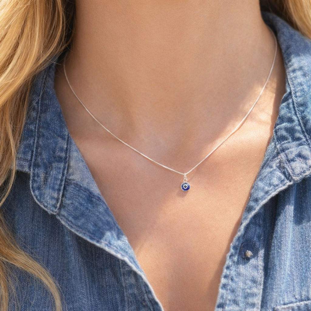 Meticulously made with a 0.5mm delicate bright box chain in sterling silver, this necklace boasts a super-miniature evil eye charm that adds a charming allure to any outfit. Its understated design and quality craftsmanship make it an ideal piece for daily wear, offering a touch of sophistication to your ensemble.