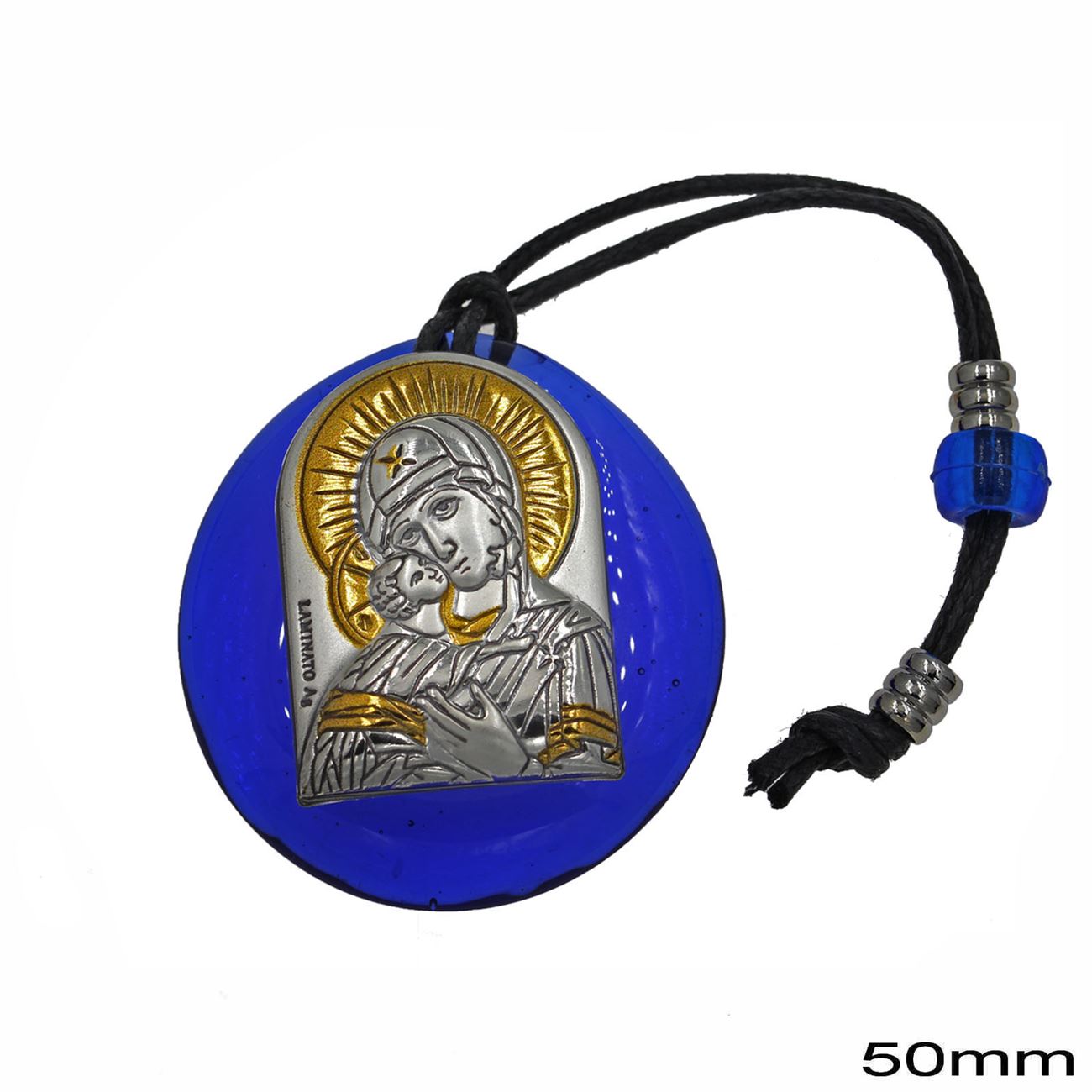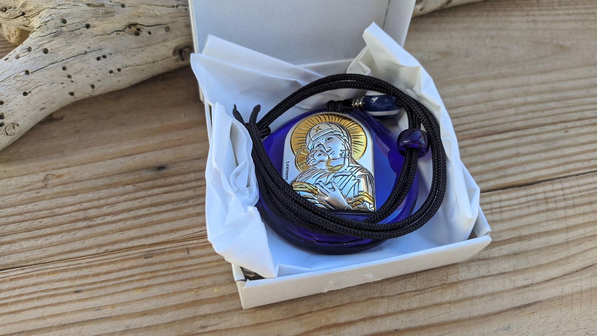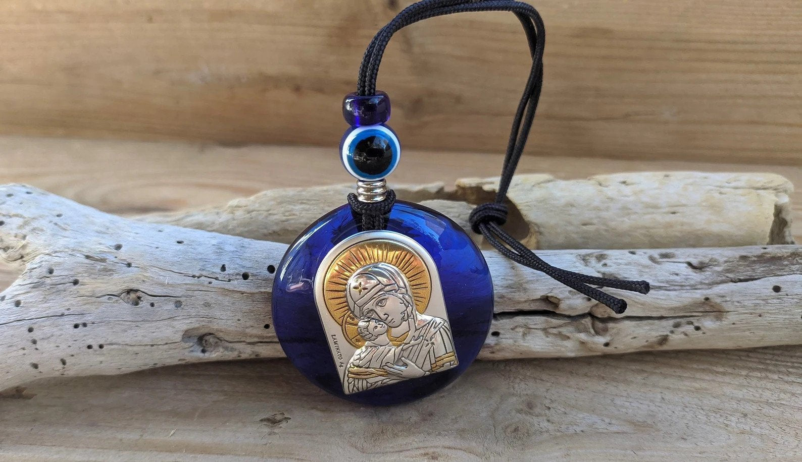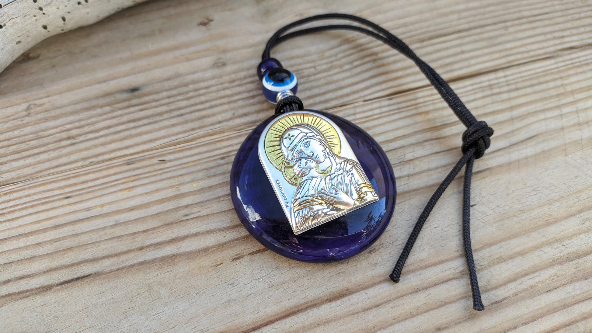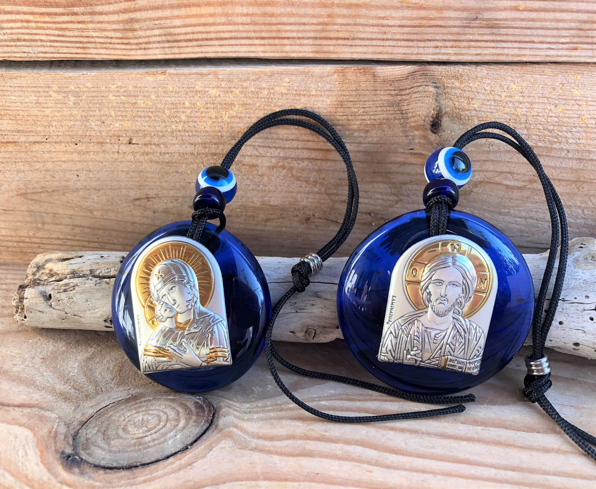 This Virgin Mary and Christ Jesus Icon Mirror Charm, crafted for house and car protection. This charm features a blue glass base adorned with a 925 sterling silver Greek icon of the Virgin Mary or Christ Jesus, suspended on a black cord alongside a blue evil eye bead.